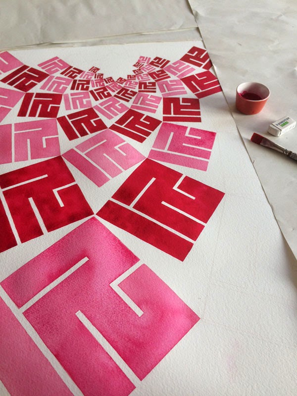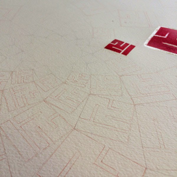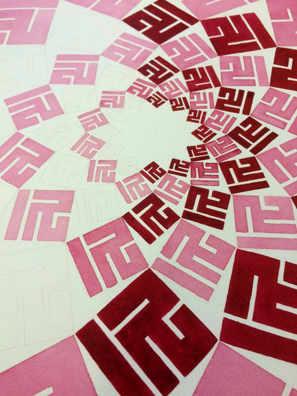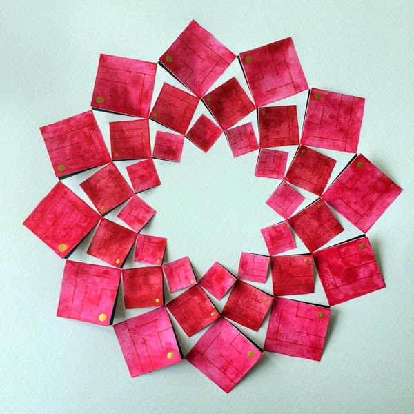 The Arabic language is not fond of abbreviations, but we do have the fascinating إلخ , equivalent of Latin “etc”. Reflecting this, the design is based on a traditional harmonic pattern of Islamic geometry, that can be extended indefinitely. The words are oriented so as to create a rotational movement in a specific direction (that of reading, spearheaded by the golden dots), and each square is cut out and its corner lifted to reveal a flash of contrasting green underneath, so that the piece comes alive as the observer moves.