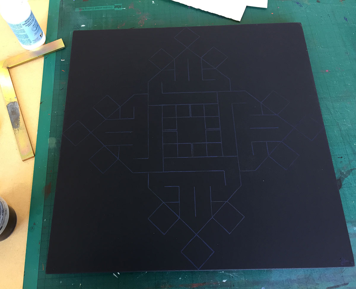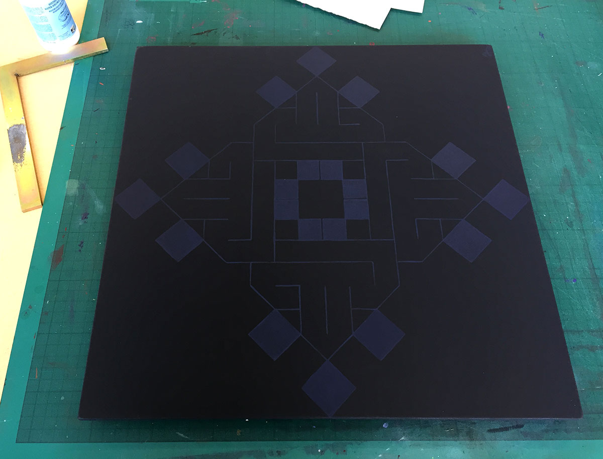 Over a deep matte black, the design is painted in black which I made slightly iridescent: from certain angles, or under certain lights, the panel appears to be a plain black square, out of which the design appears, ghostly, as one moves.