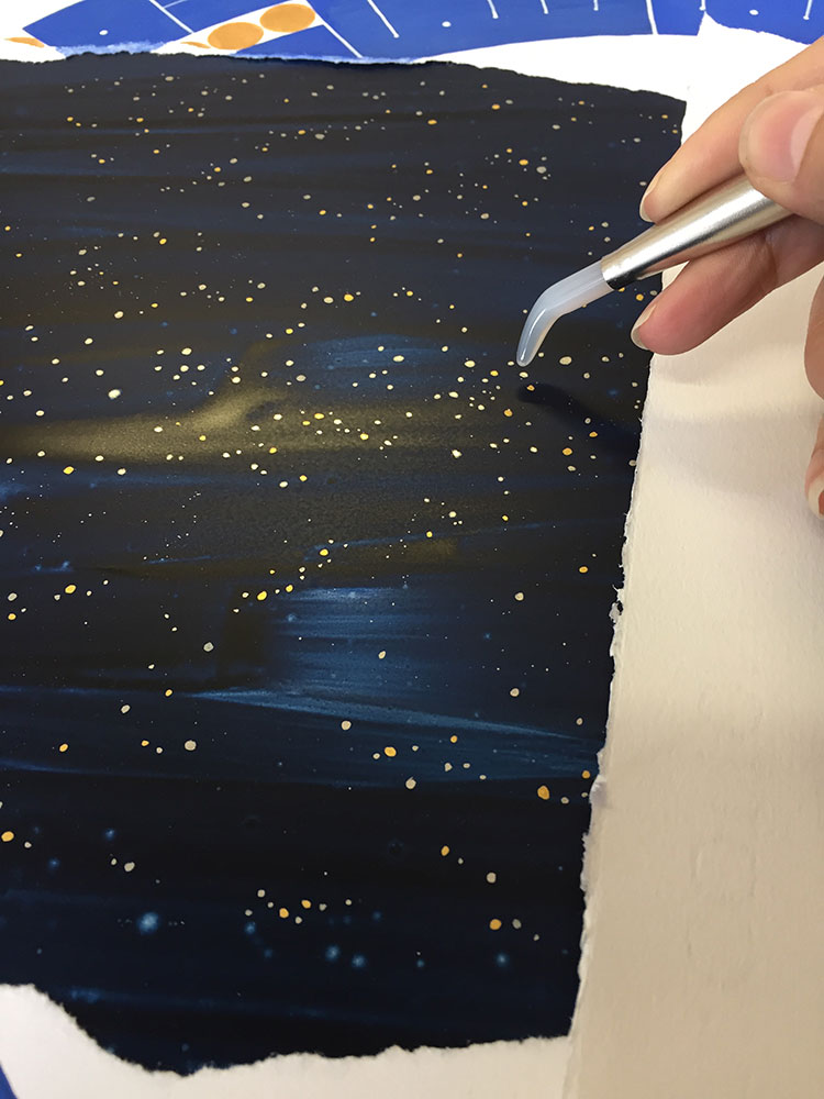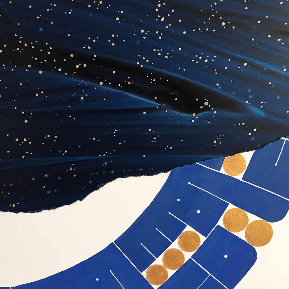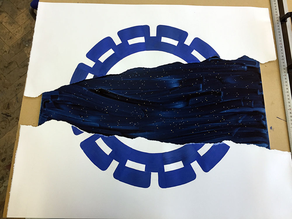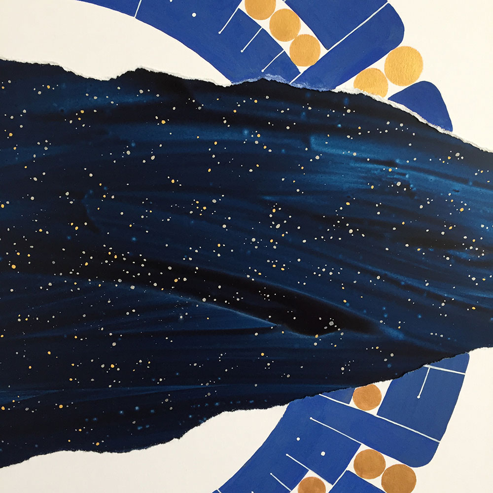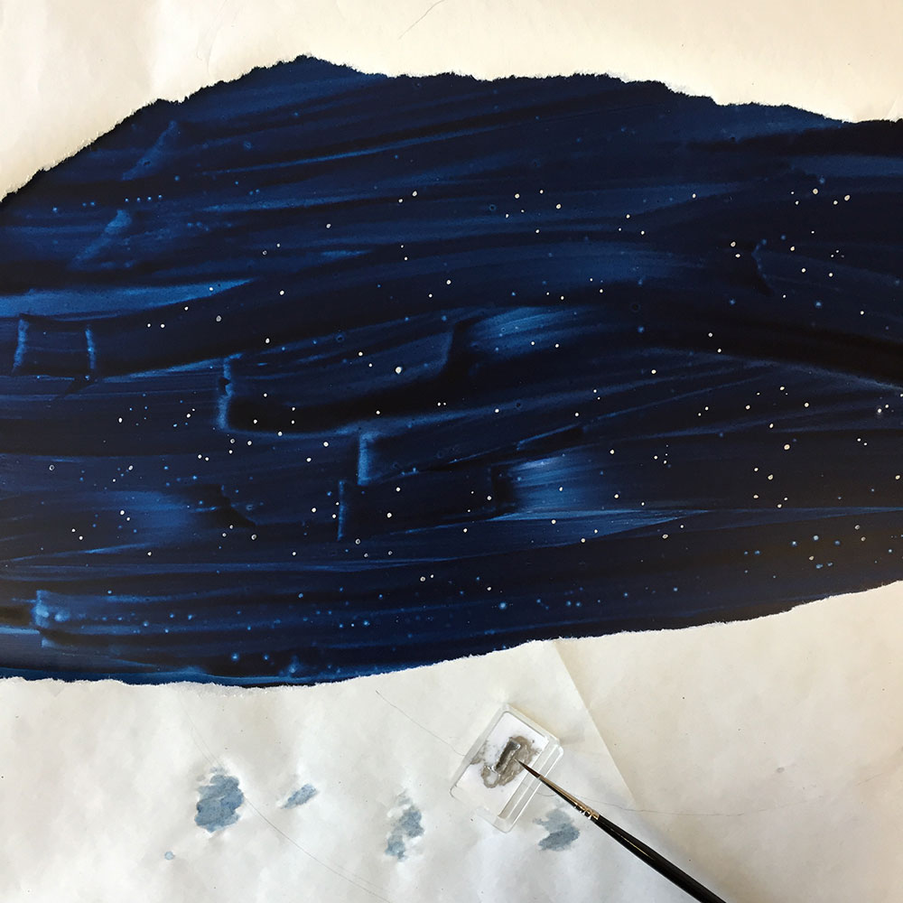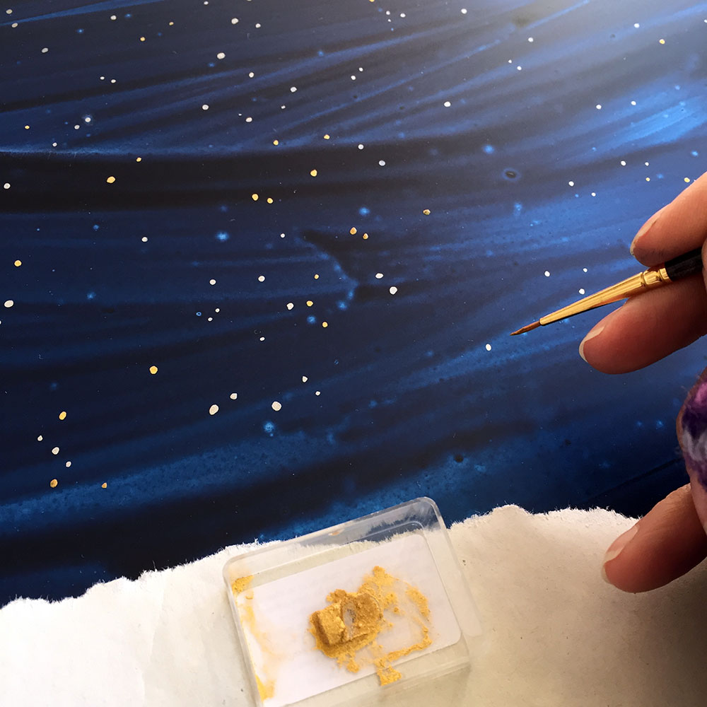 In this piece inspired by a dream, the “visible world” is spelled out in the foreground mandala, which is torn to reveal a whole other world behind it, much like a painted theater background that collapses to reveal the reality behind it. This impression is reinforced by the contrasting treatment of the two planes. In the foreground I deliberately dulled the blue and used golden gouache for the dots, instead of the usual, much more gold-like metal leaf. The background on the other hand, unstructured and boundless, is painted over aluminium which shines through the watercololour, providing a mysterious depth. The myriad stars are painted in shell gold 23.5ct and shell palladium, then burnished, in order to truly sparkle.