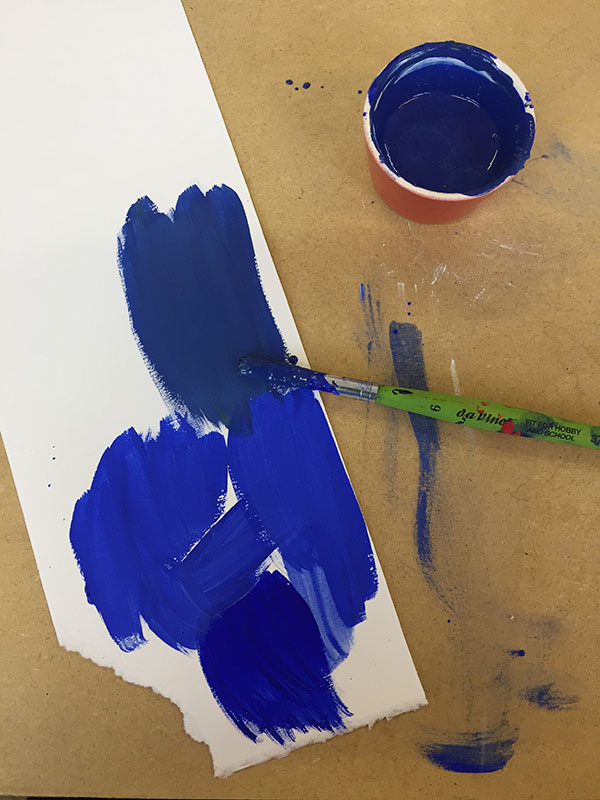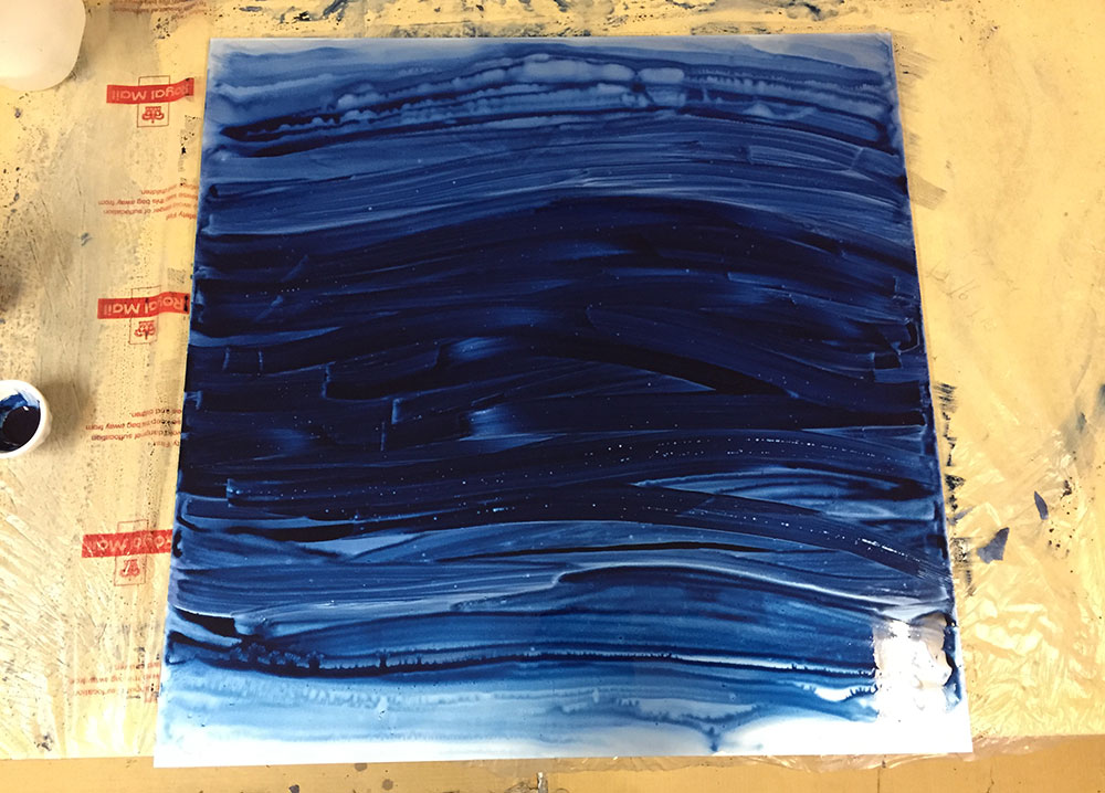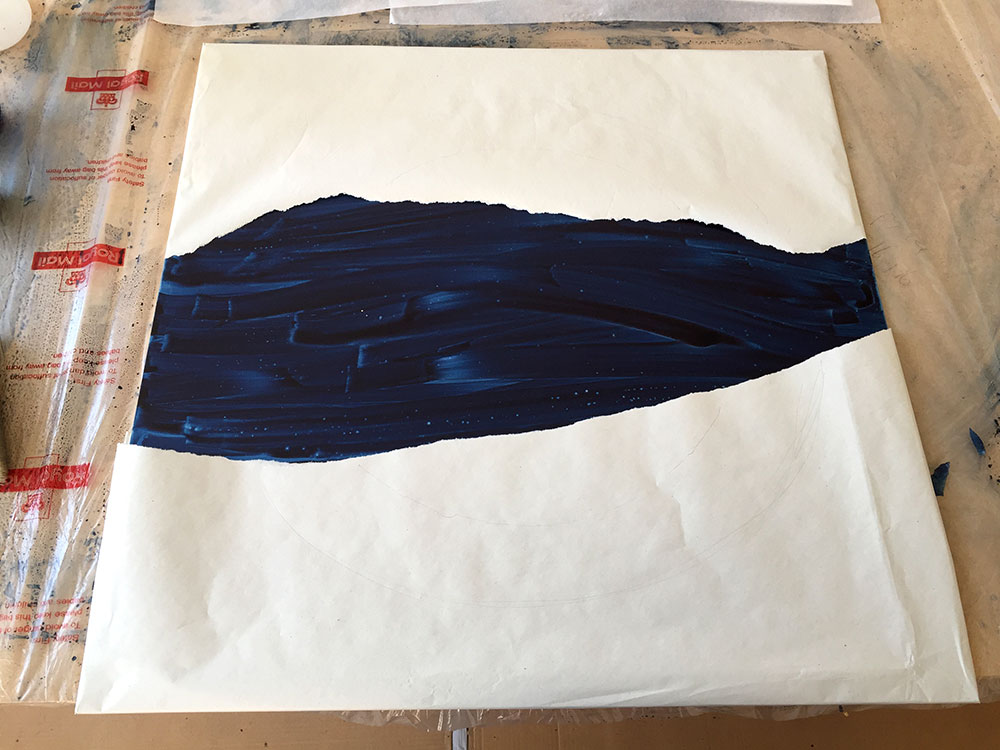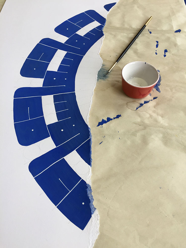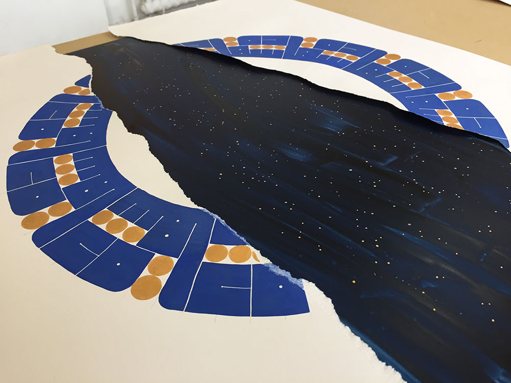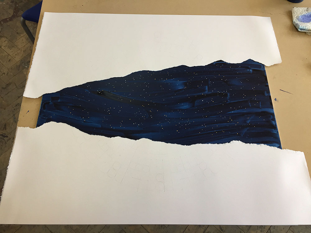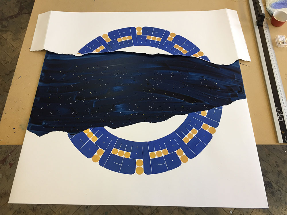 In this piece inspired by a dream, the “visible world” is spelled out in the foreground mandala, which is torn to reveal a whole other world behind it, much like a painted theater background that collapses to reveal the reality behind it. This impression is reinforced by the contrasting treatment of the two planes. In the foreground I deliberately dulled the blue and used golden gouache for the dots, instead of the usual, much more gold-like metal leaf. The background on the other hand, unstructured and boundless, is painted over aluminium which shines through the watercololour, providing a mysterious depth. The myriad stars are painted in shell gold 23.5ct and shell palladium, then burnished, in order to truly sparkle.