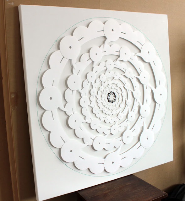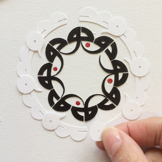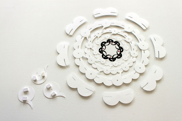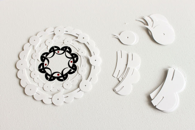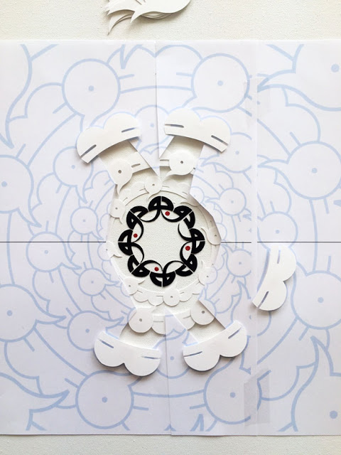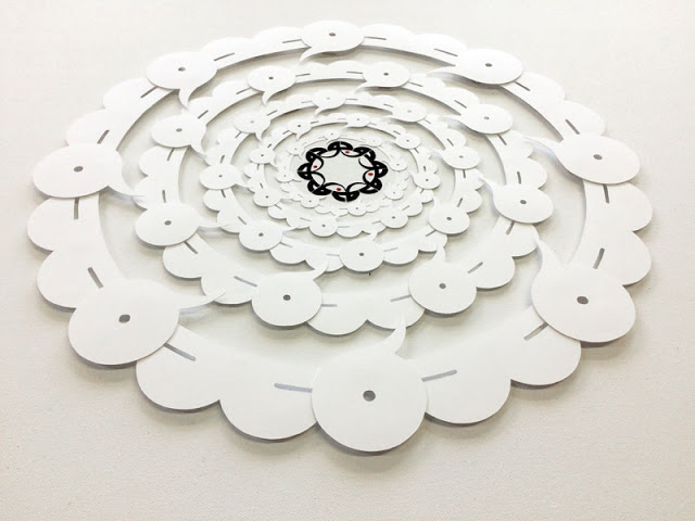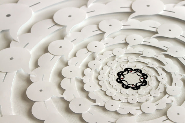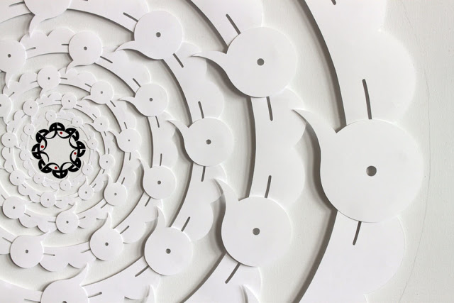 At the centre is Being, occupying a tiny area of the canvas which is otherwise filled with Non-Being. Our friend mentioned that “dark matter” was an unfortunate name so I wanted to move away from associating it with black, and as the paper equivalent of the black emptiness of space is whiteness, I decided to use cut paper, white on white. The word stretched into a green ring can just be guessed: it is just a glimpse, similar to what we observe through gravitational lensing, of what lies much further out, beyond the Nothingness — what Sufis call Absolute Truth.
