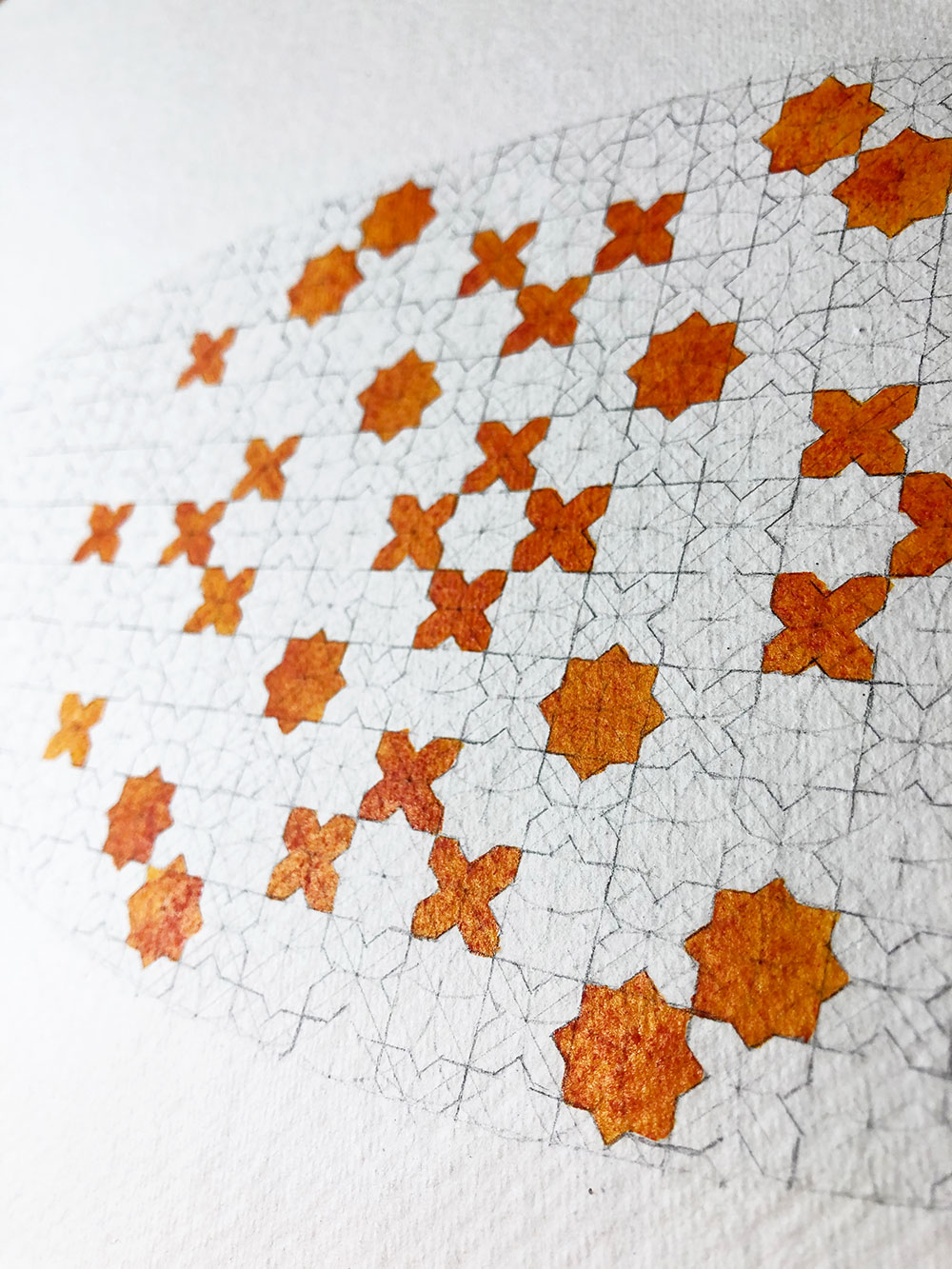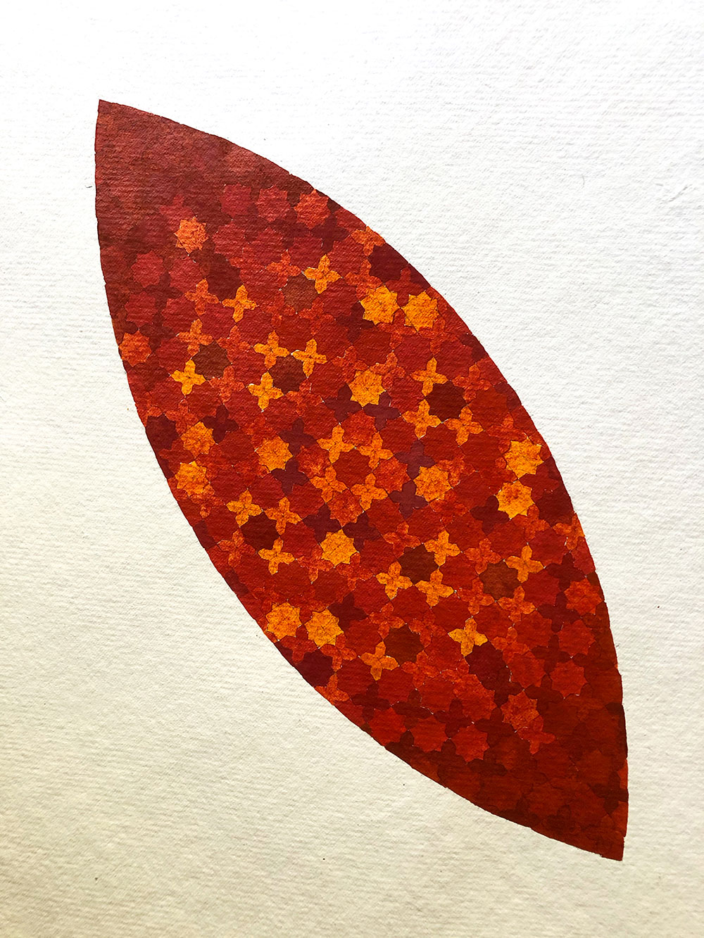I used historical pigments in mixtures I had just been testing in the context of my research on medieval middle-eastern inks and paints: cinnabar, minium, red ochre and soot, intensified with saffron. The medium is egg tempera, which doesn’t belong to that tradition but allowed me to layer and glaze the colours until they looked unified in their diversity, as if bathed in the same red light or circulated by the same blood.