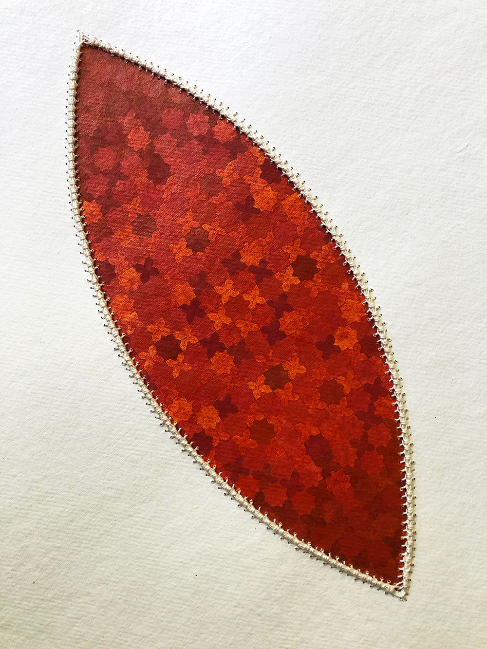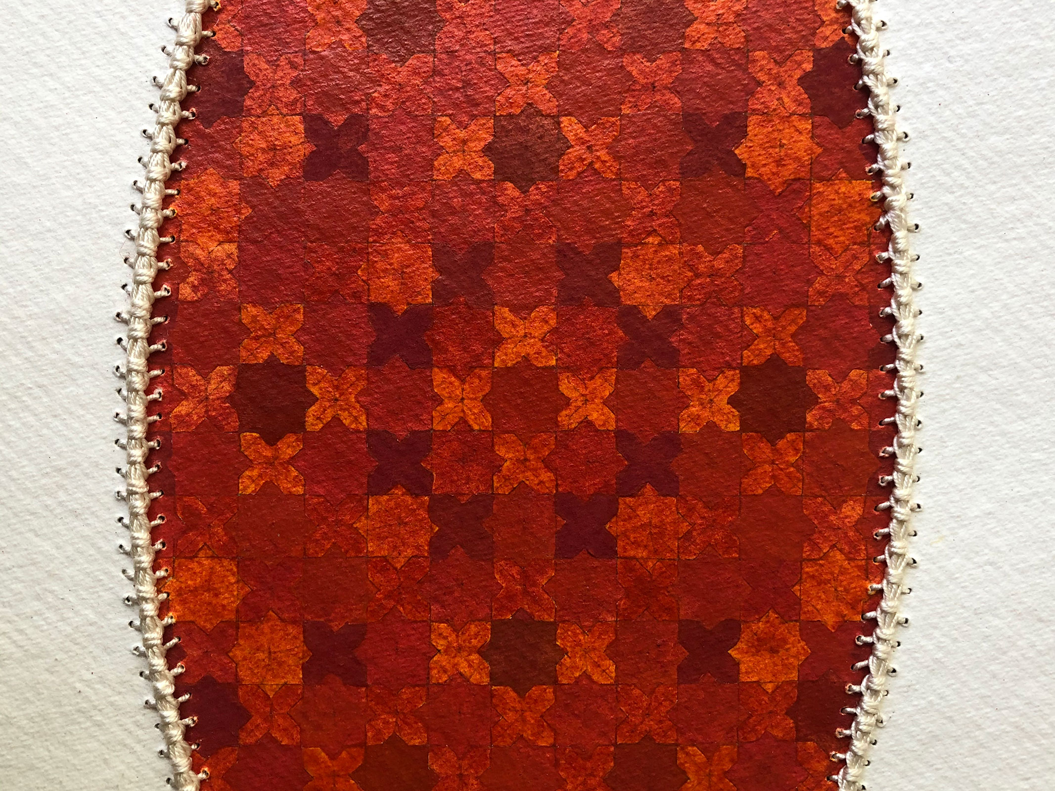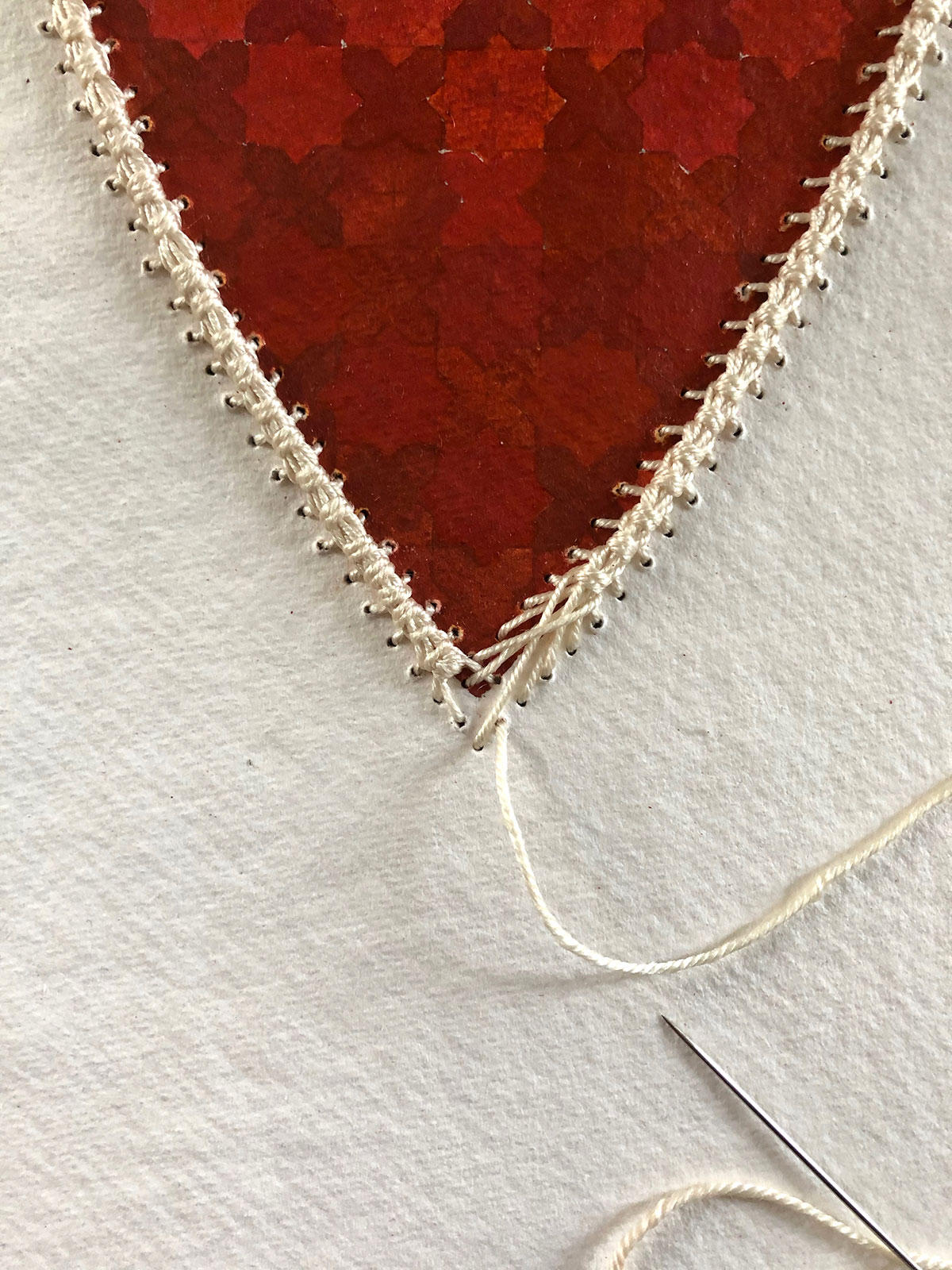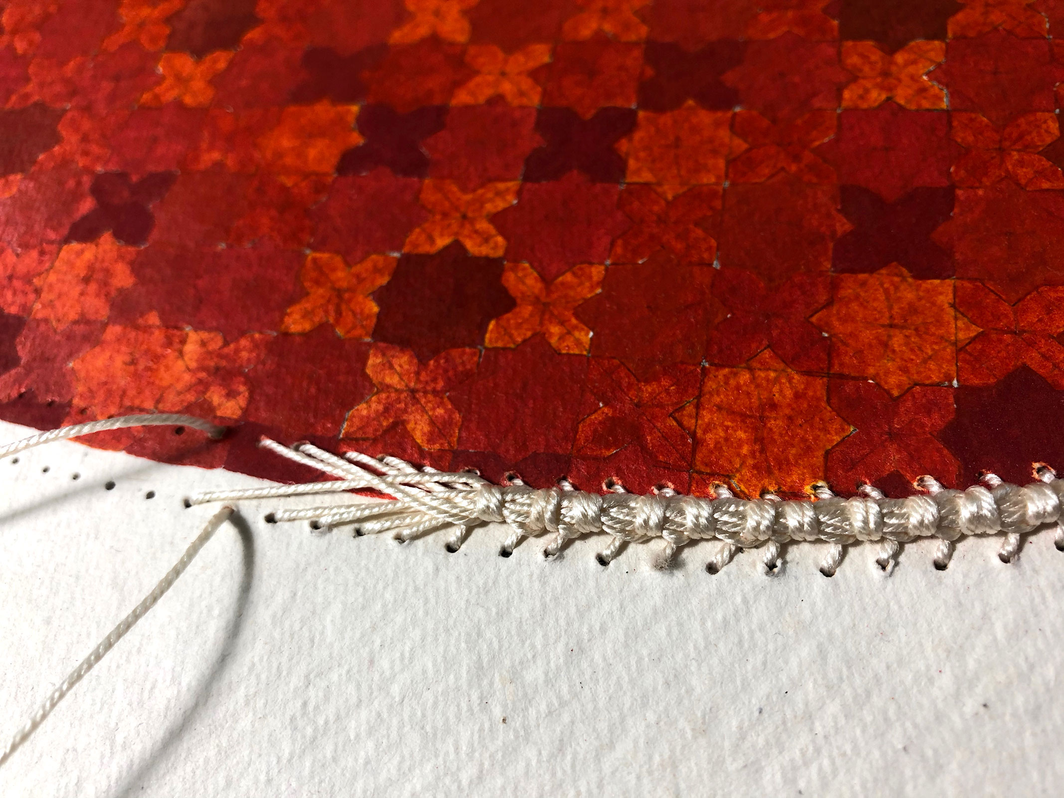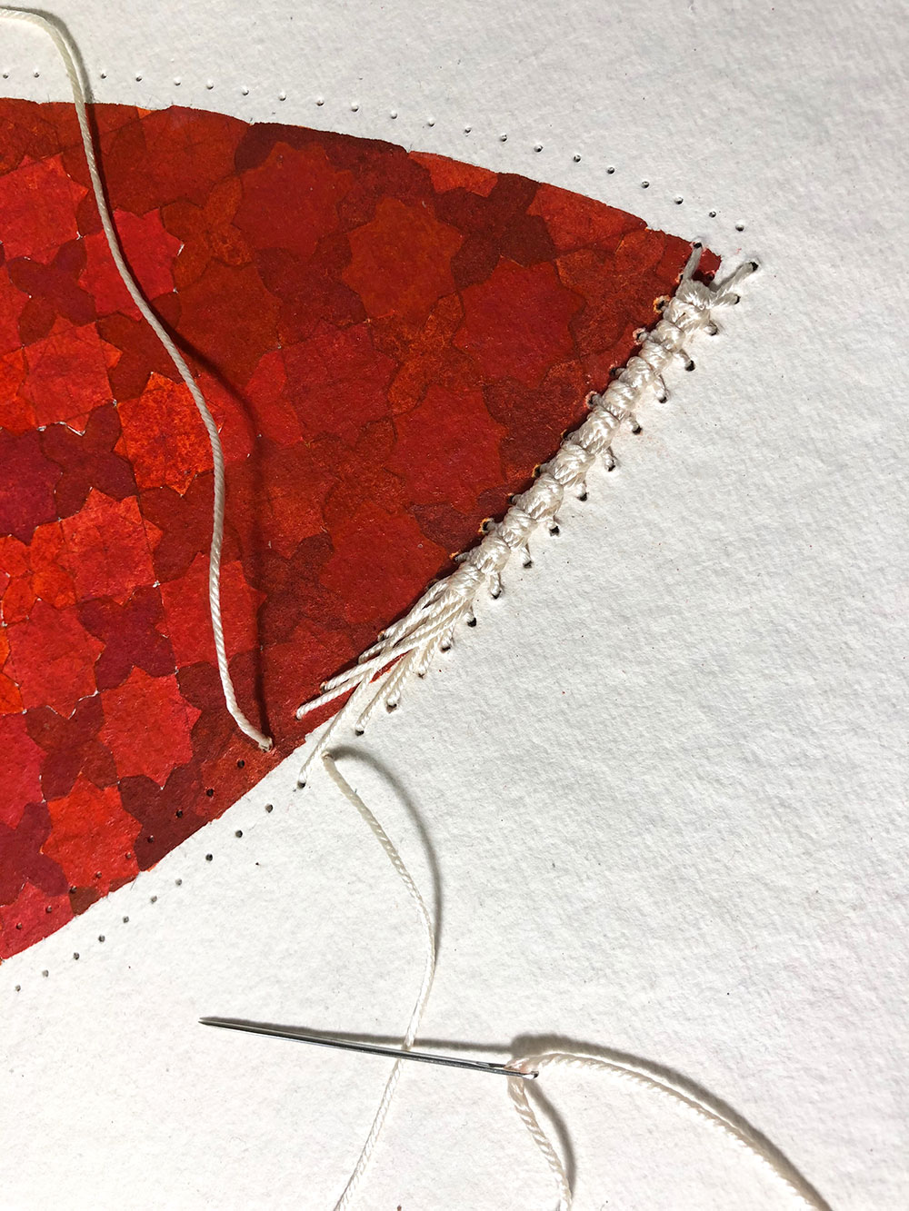 The caterpillar binding stitch is a solid boundary that does much to convey the impression of a passage opening in the paper. Though beautiful, it is uncomfortable, evoking stitches on a wound.