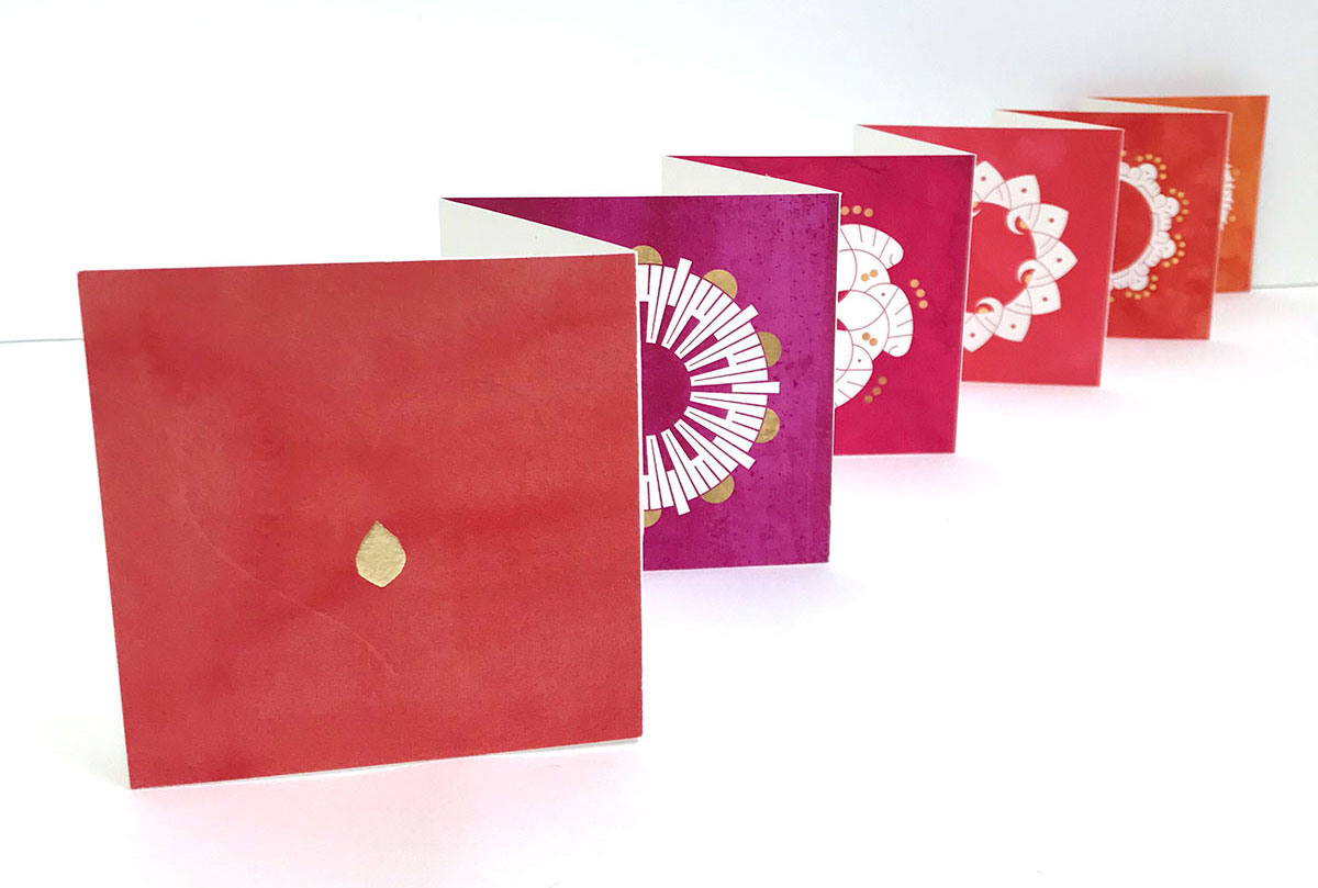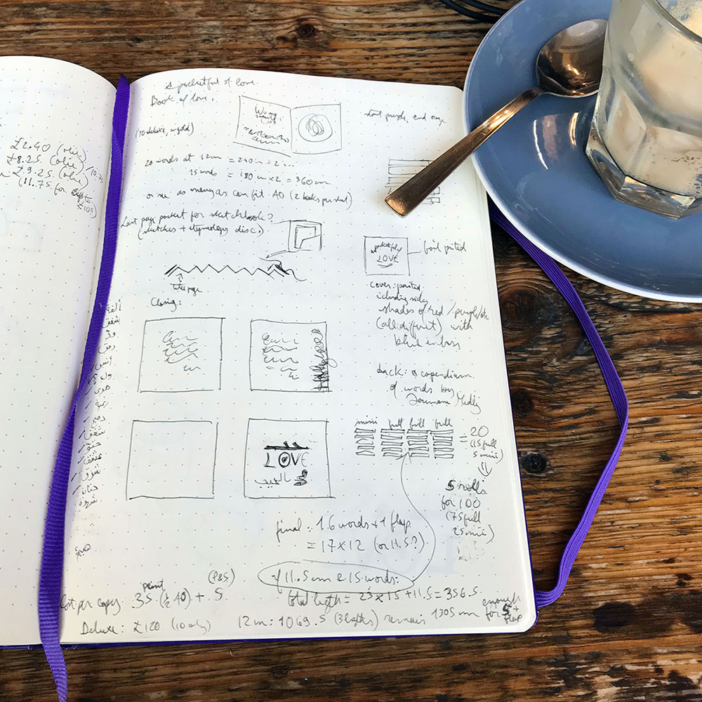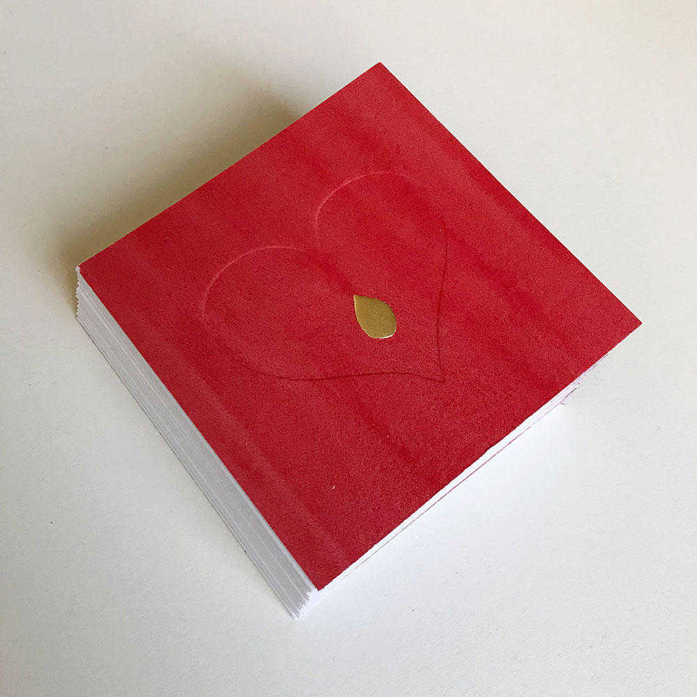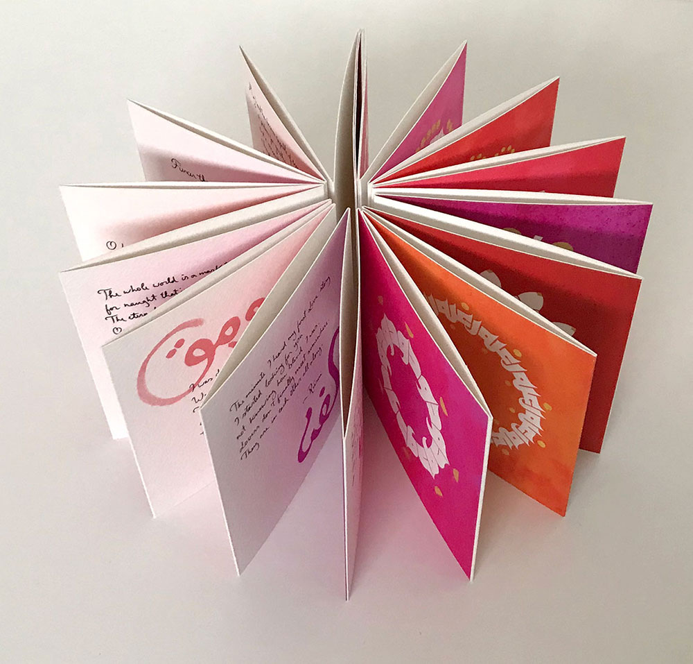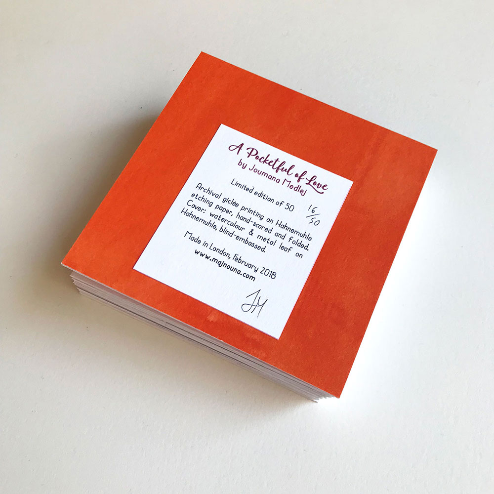 The body of the concertina is printed with archival, pigment-based giclée on beautifully tactile Hahnemule etching paper, which I cut, fold and assemble by hand. The covers are painted in watercolour, blind-embossed using a wonderful old-fashioned press, and finished with gold metal leaf. (The cover design, a golden seed inside a heart, is a reference to the seminal Arabic word for “love”, hubb, which also means “seed”).