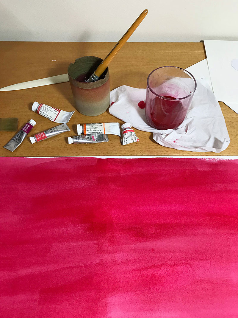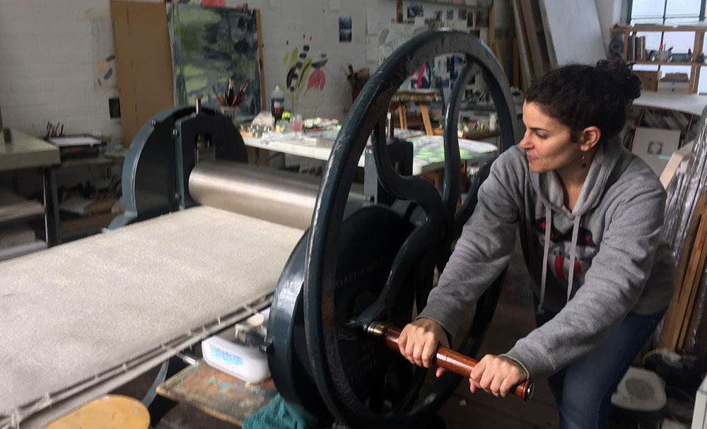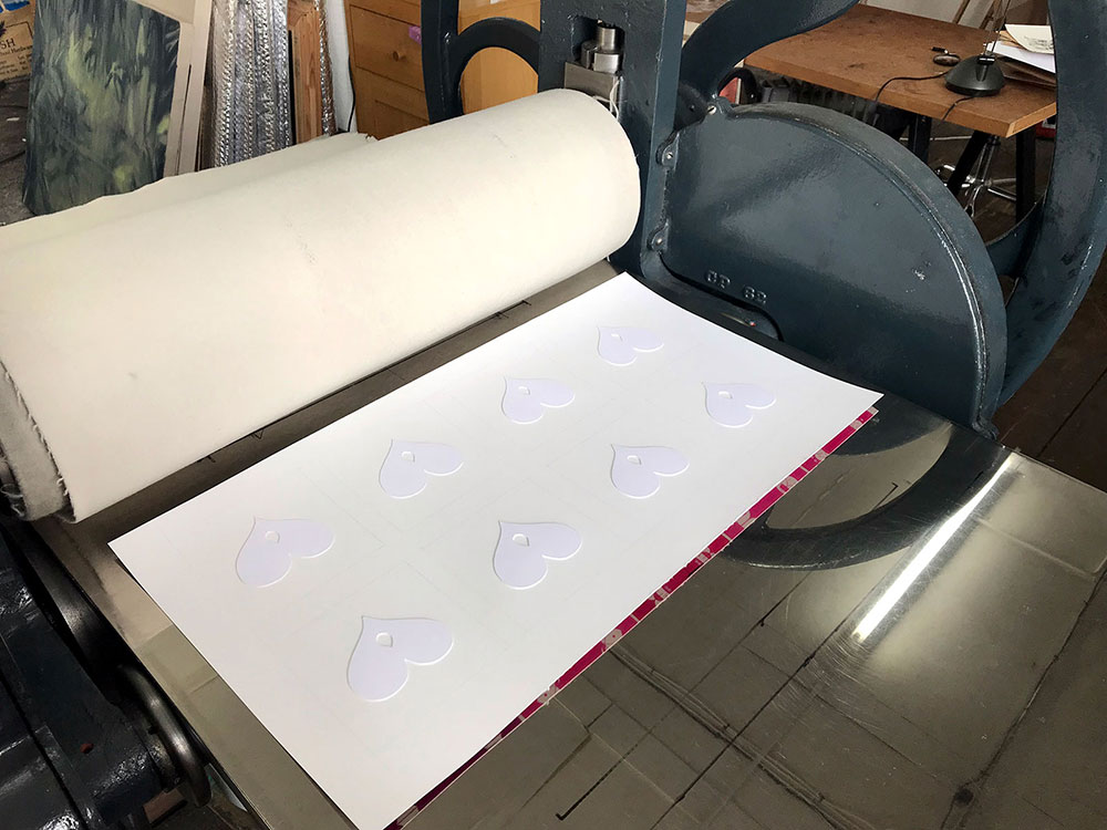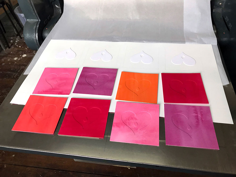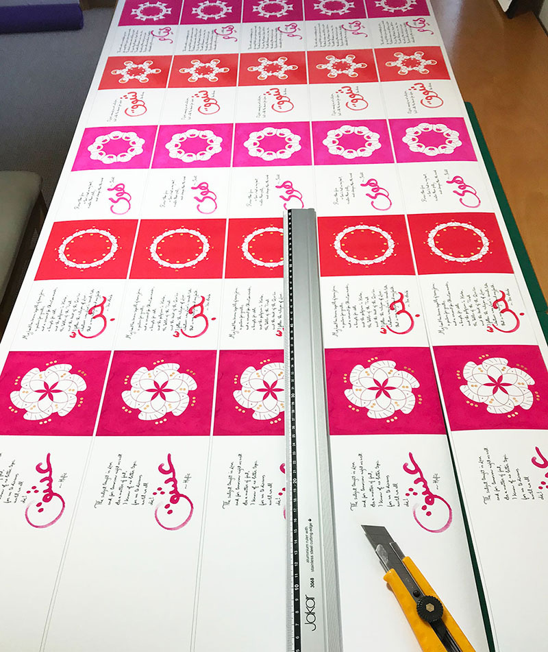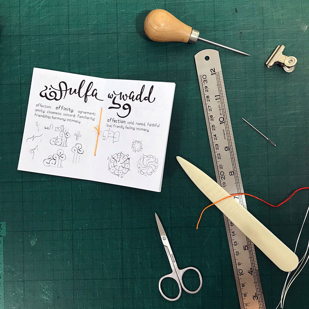 The body of the concertina is printed with archival, pigment-based giclée on beautifully tactile Hahnemule etching paper, which I cut, fold and assemble by hand. The covers are painted in watercolour, blind-embossed using a wonderful old-fashioned press, and finished with gold metal leaf. (The cover design, a golden seed inside a heart, is a reference to the seminal Arabic word for “love”, hubb, which also means “seed”).