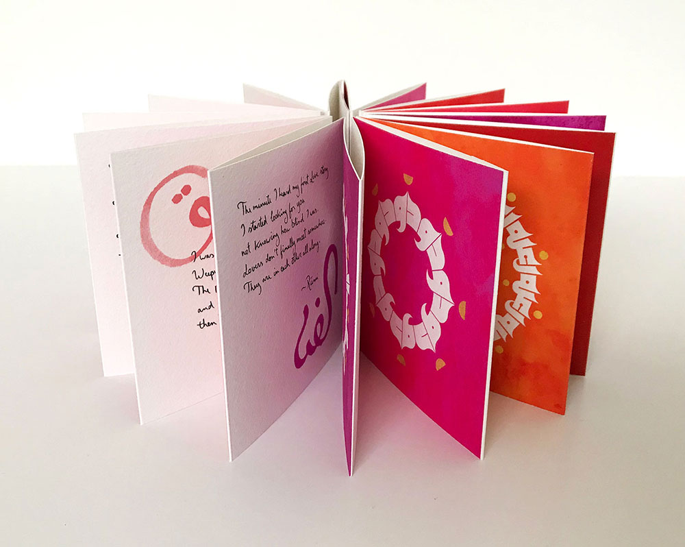 The art and calligraphy are my own; the Sufi poems were selected to amplify the words, and also confer a double meaning on the book: human lover or divine Beloved?