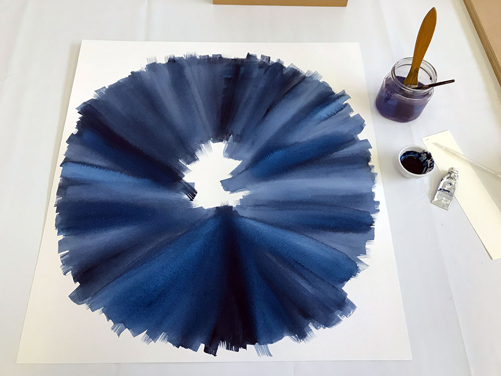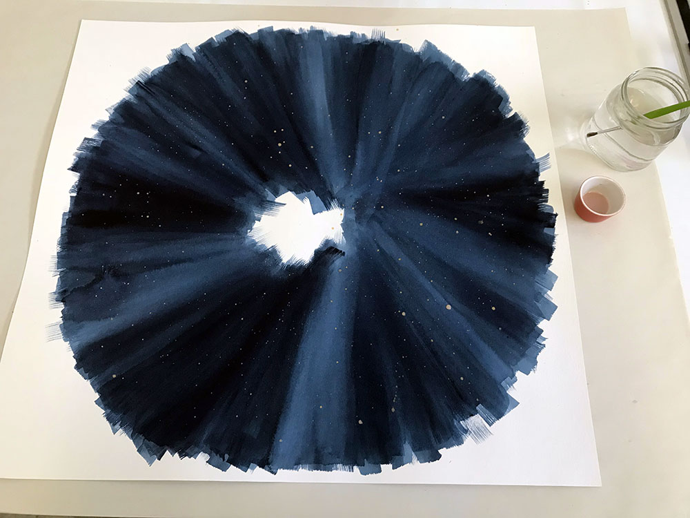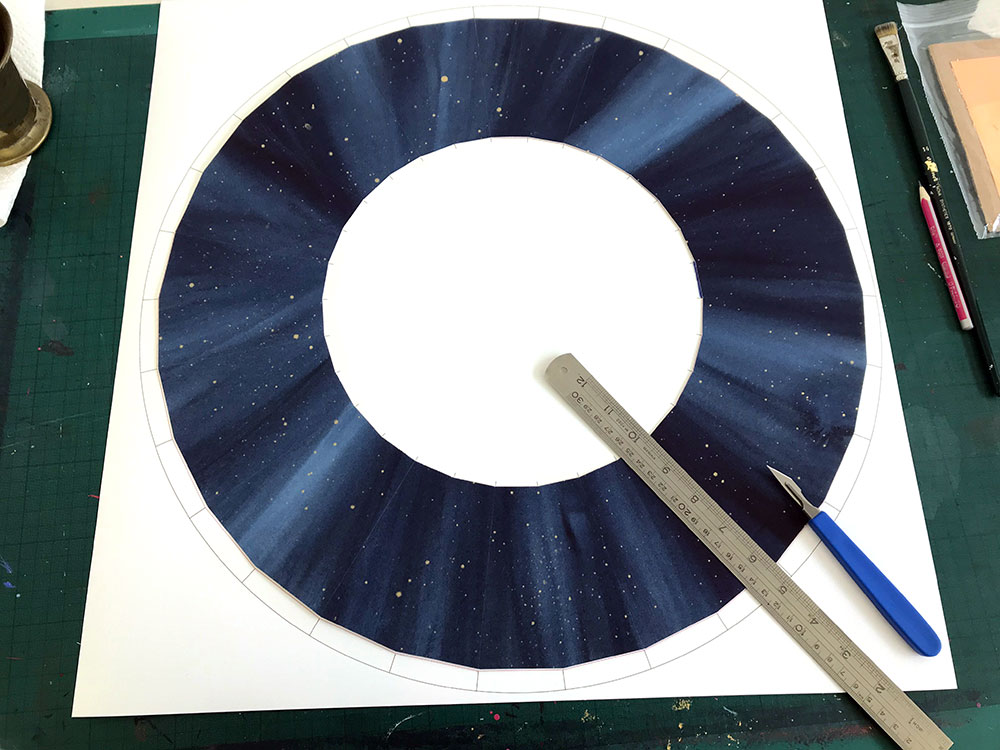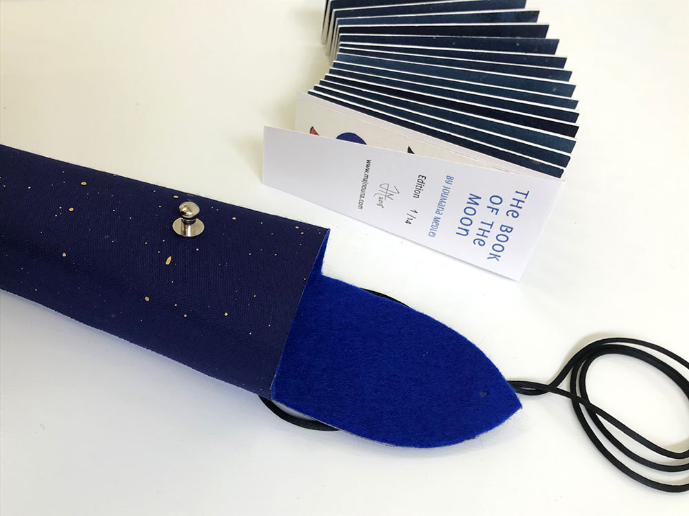 The original spread was painted with period-accurate materials, and fourteen copies were printed with museum-quality giclée process on etching paper. I painted the back of each with watercolour, sprinkled it with golden star; added gold and silver metal leaf to the illustrations; cut, scored and folded the book. Finally, I created a pouch, made of sturdy, royal blue bookcloth which I also sprayed with gold, and lined inside with genuine wool felt to store the book safely and allow it to be worn around the neck.