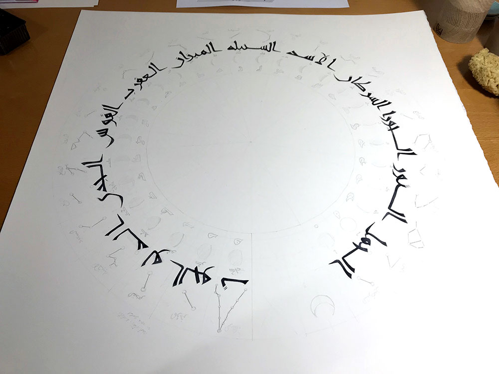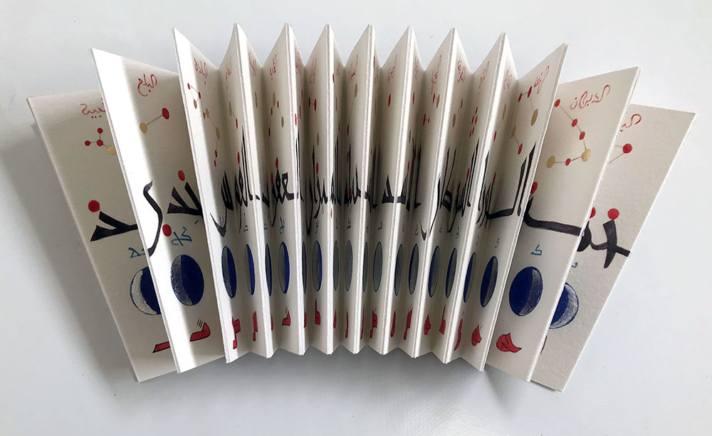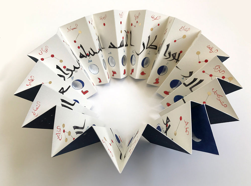 Like an ancient magical talisman, this small book emerges from its carrying pouch to unfold into a complete circle. The twenty-eight phases of the moon are revealed, along with the mansions (manazil, groups of stars) and zodiacal signs it travels through, and the twenty-eight letters of the Arabic alphabet that are said to be closely associated with this cycle.