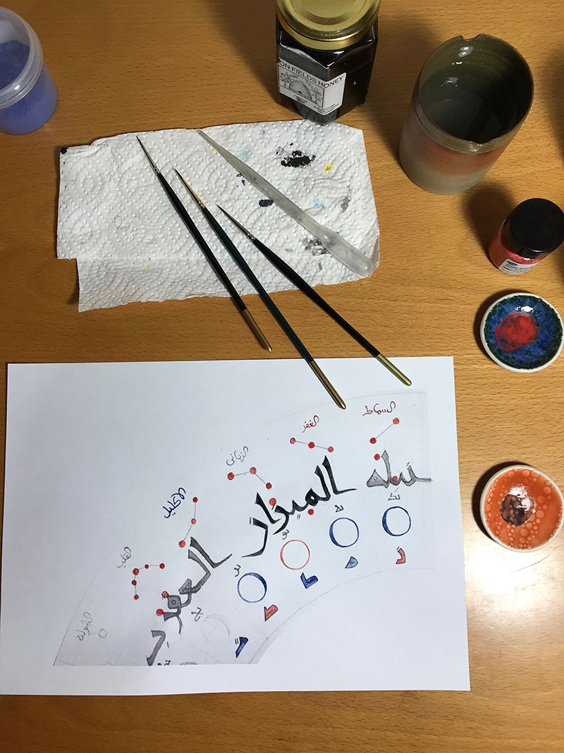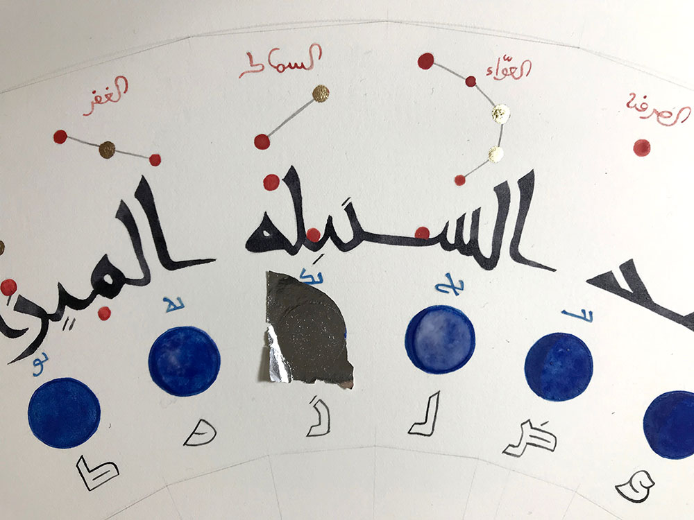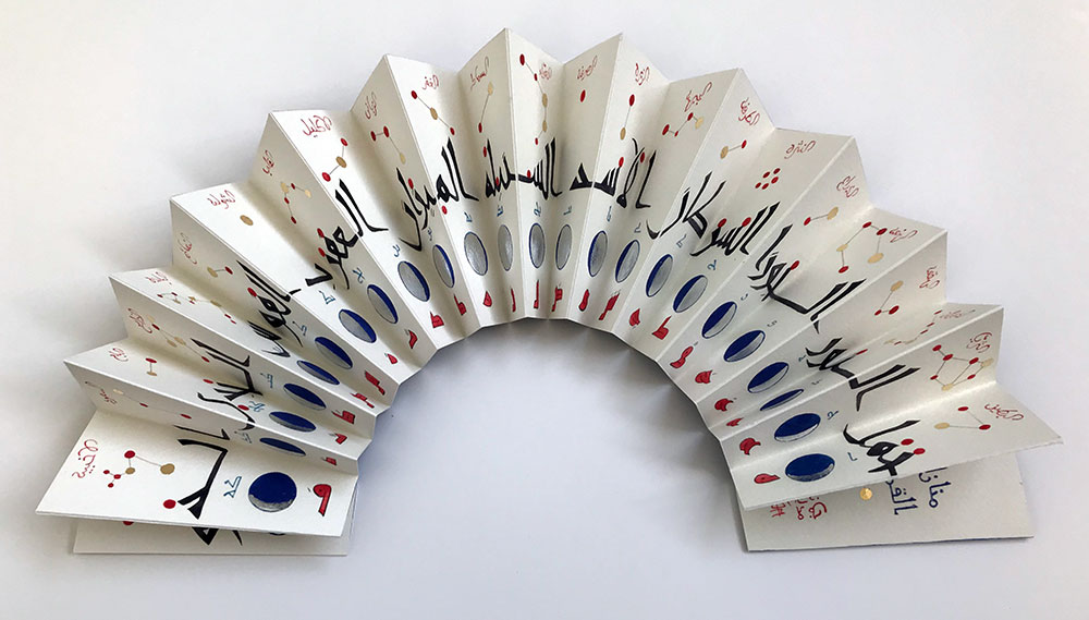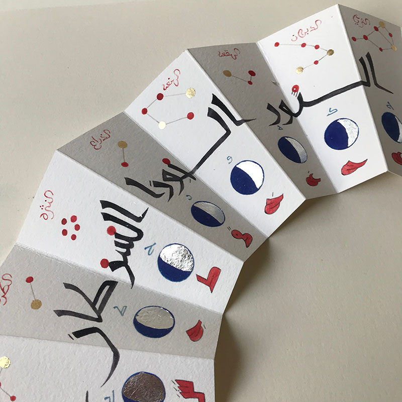 Made in an edition of only 14, a moon-related number, this book was inspired by medieval Islamic astronomical charts and their visual language. The diagrams of the constellations are accurate, but simplified in the style of period texts. I used four different early scripts for the different layers of information, although I am more interested in their capacity to evoke a sense of wonder than in them being deciphered.