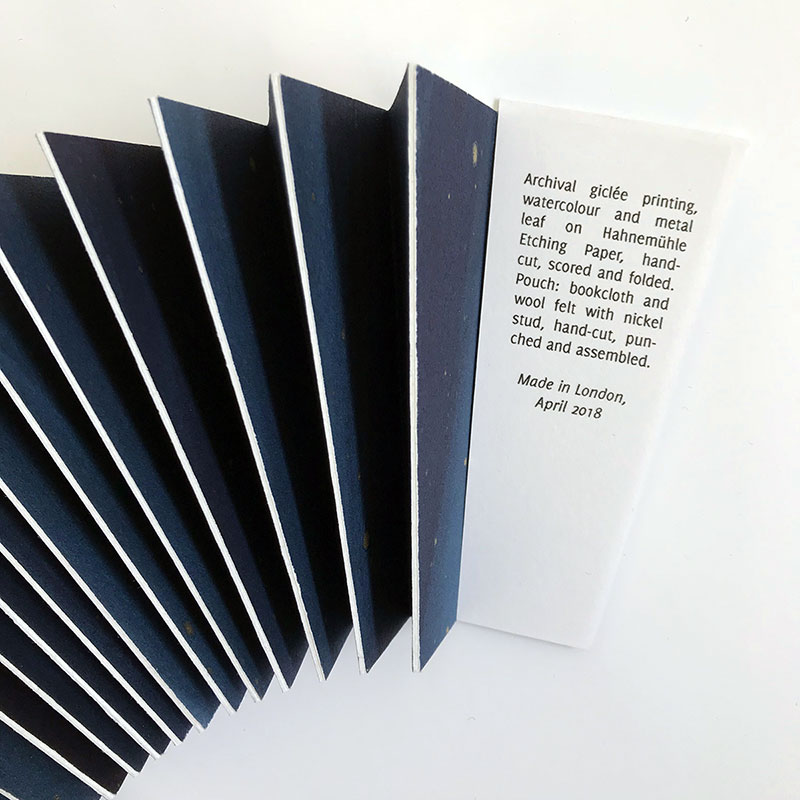 Approximate dimensions of the closed book inside the pouch are 5x11x2.5 cm. When fully open, it forms a circle of roughly 50 cm diameter, and it can be framed that way (with the cover pages tucked behind the past two pages). Each copy is signed and numbered out of 14.