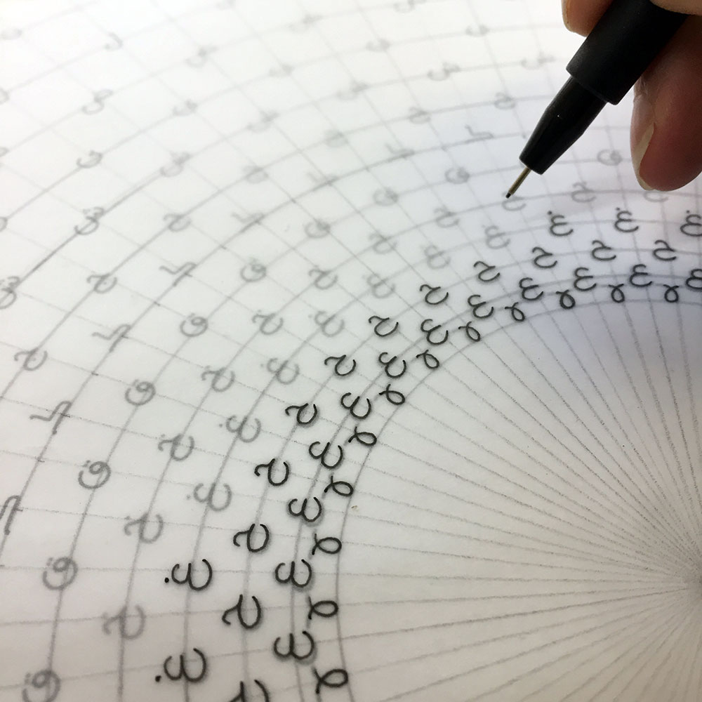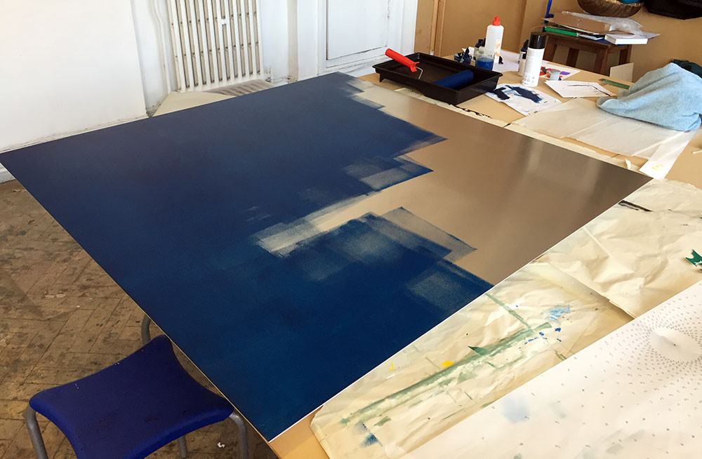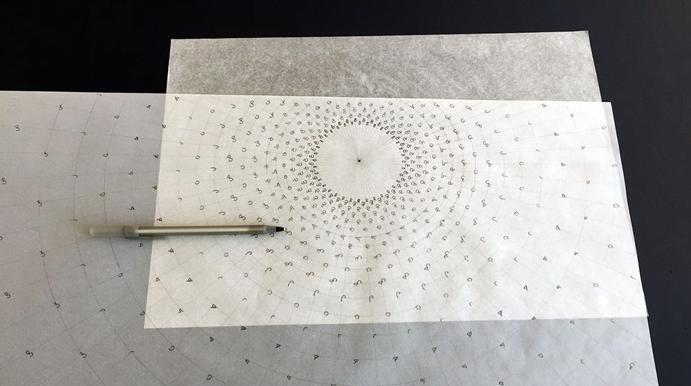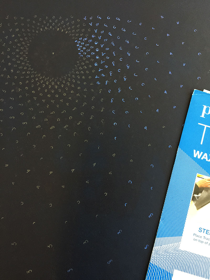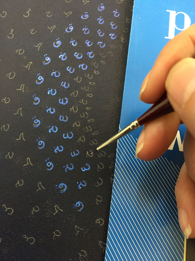 The phonetic sequence is represented here, from hâ to wâw, with a single hamza at the centre. The scale of the letters is minute and they are executed in interference medium, which, depending on the light, can appear almost as dark as the prussian blue background, or shine brightly. In this way they create the feel of a fine misted gradient when seen from a distance.