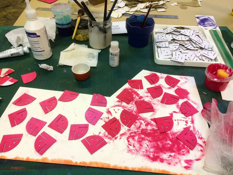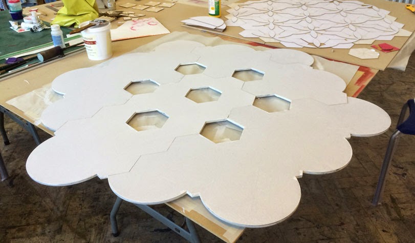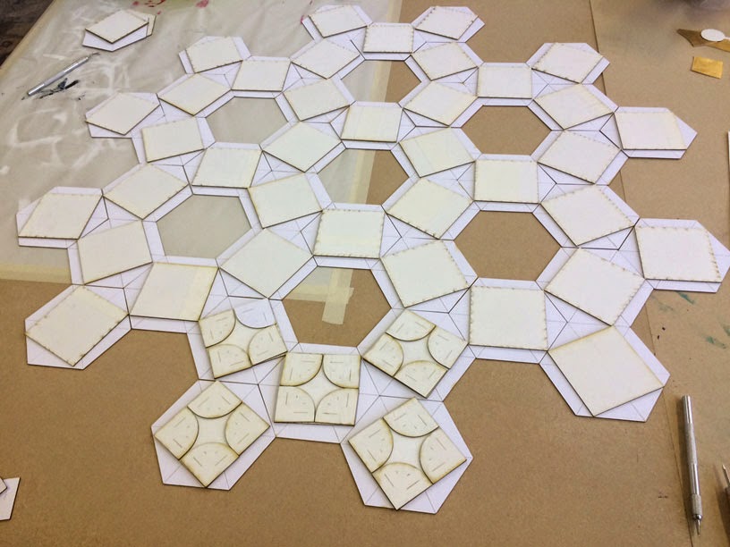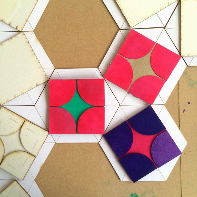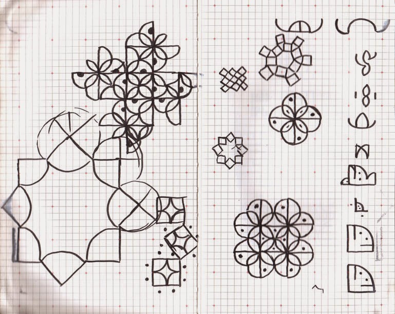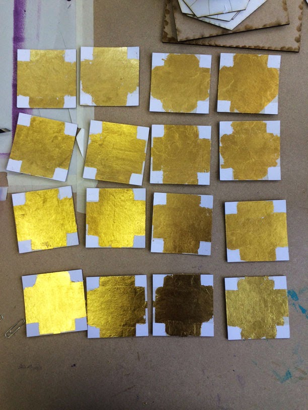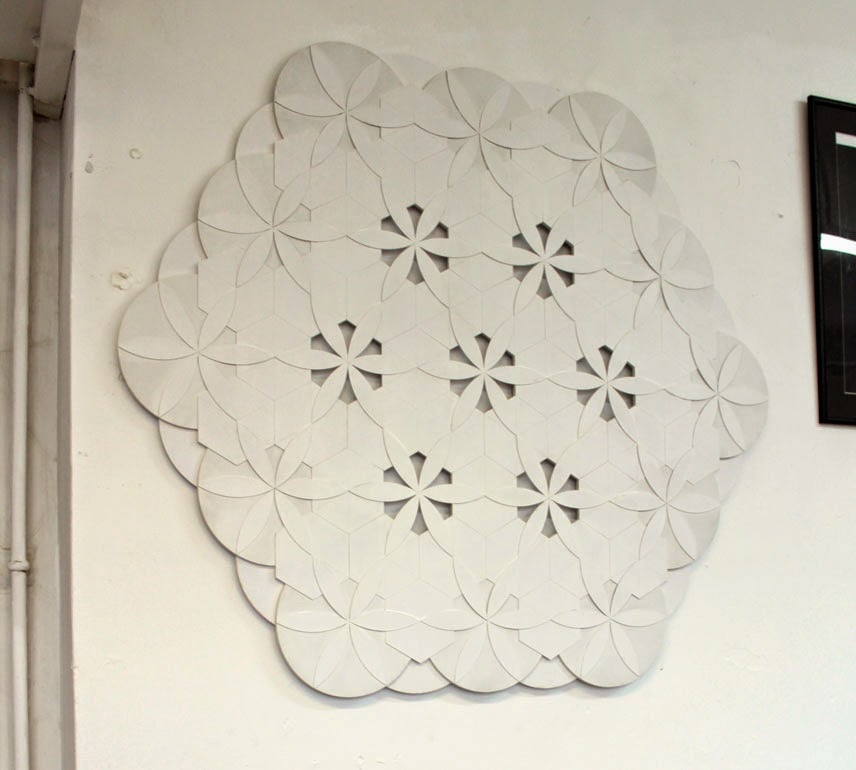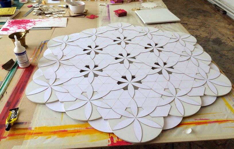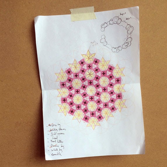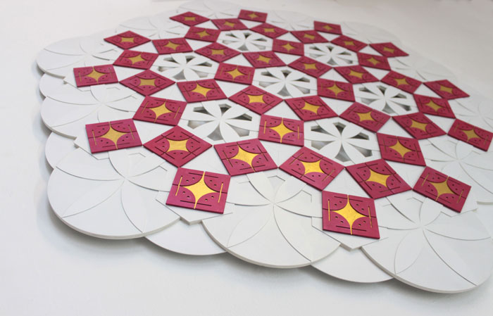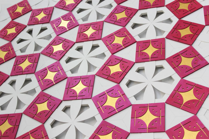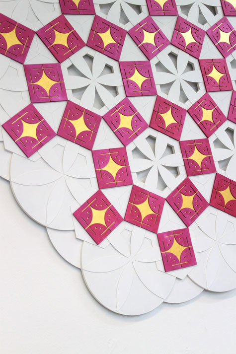The design took the shape of a traditional geometric pattern, to which I added dimension by means of layers and by revealing the grid on which the pattern is constructed. This grid, in white, seems to emerge from the surface of the white wall and crystallize into the vivid design; it adds complexity without interfering visually, since it is defined mostly by its own shadows. Gold leaf of the highest carat was used for its unmatched rich yellow colour, while the pink lettering is coated in interference medium so that it shimmers purple depending on the light.