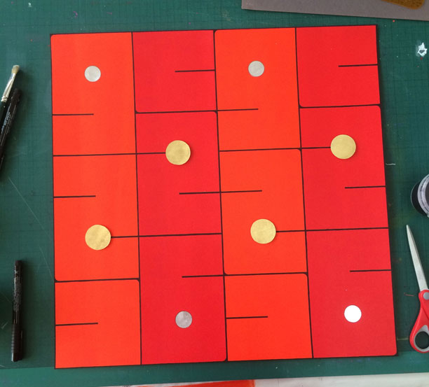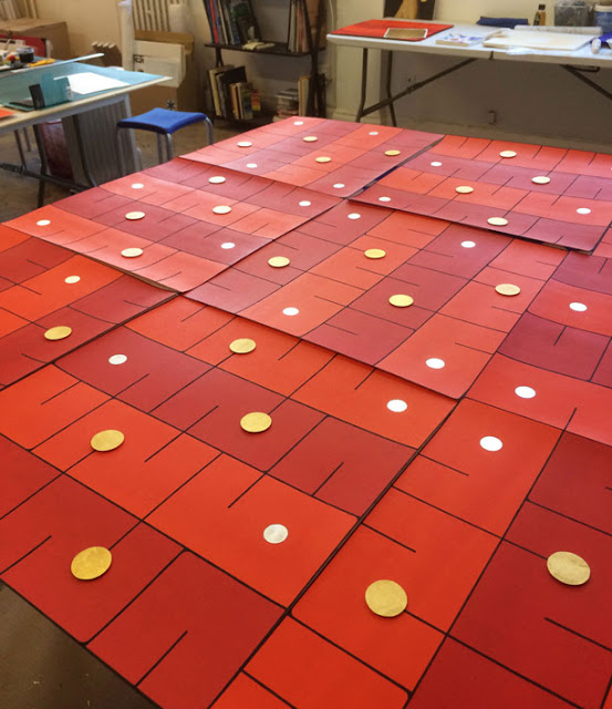 A monumental version of an earlier small piece. While the design appears static at first, this is the Ecstasy (وجد) contained within “the secret heart”: As one contemplates the square, which is a symbol of wholeness coming into consciousness, swirling patterns appear and begin their dance, with the dots seeming to float over the paper from which they are lifted by their metallic sheen.