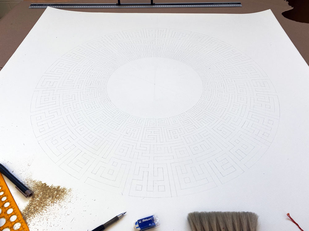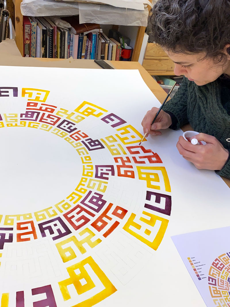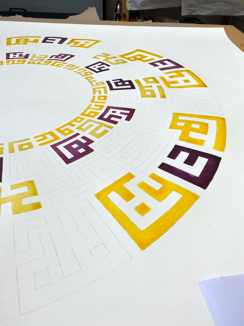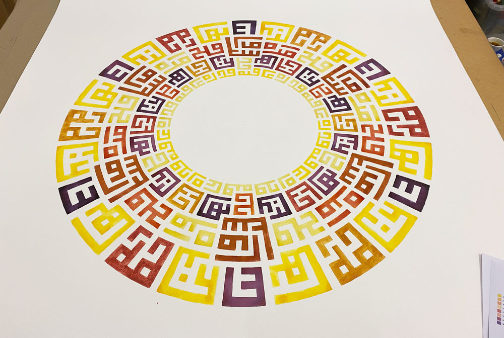 The subject was inspired by the Islamic tradition of decorating surfaces with words expressing blessings and good wishes, as seen from the walls of Alhambra to Khorasan metalware and Nishapur ceramics. Researching this practice, I collected a long list of wishes, some of them I’ve worked with before: health, joy, well-being. But as the inscribed objects were often meant for rulers or would-be rulers, most of the words used were along the lines of: victory, dominion, influence, wealth, status, luxury, power, praise… Empty pursuits in my book, but they provided the idea.