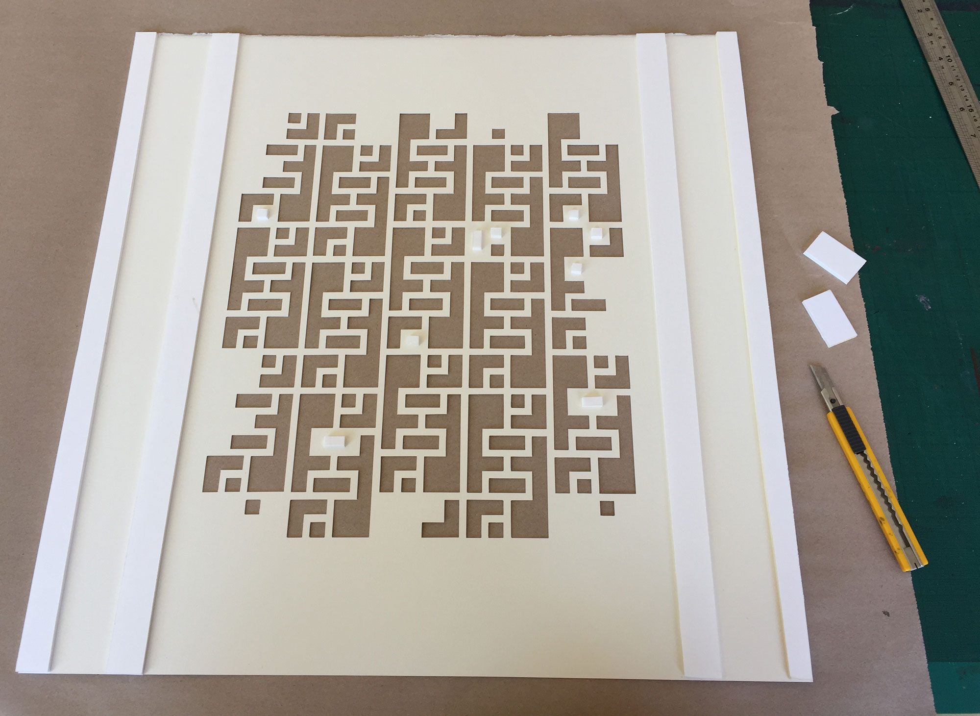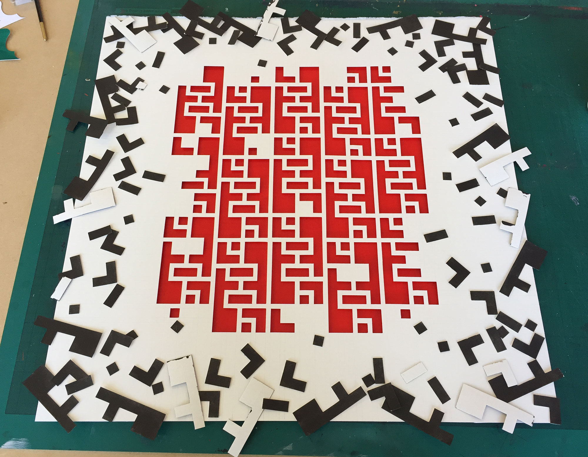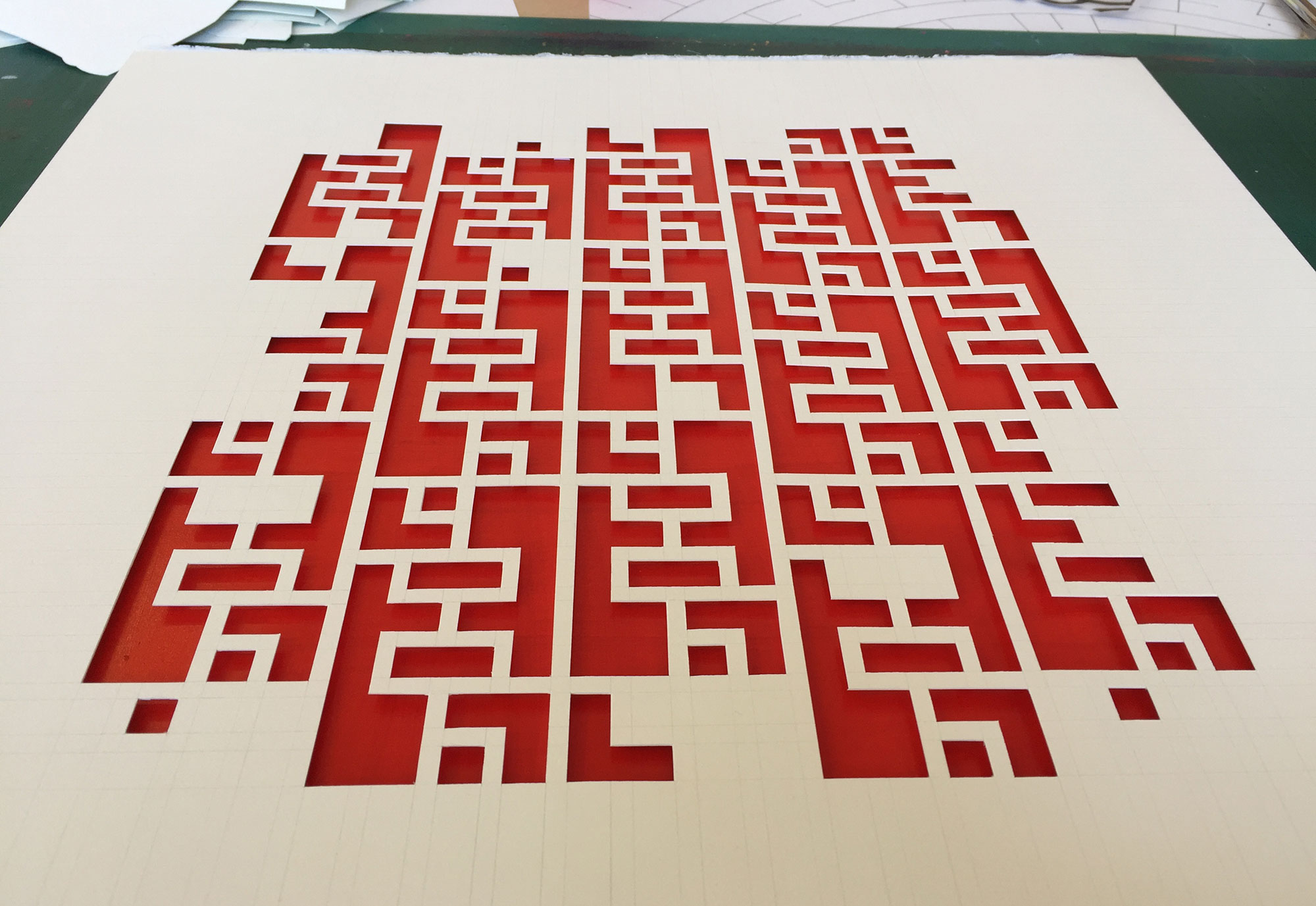 Flight: Chunks of paper are cut out of the gentle pencil grid of peaceful society, and moving away in such a disorderly manner it feels like there has been an explosion. They leave behind a gutted grid, evoking gutted buildings with the red of fire and blood. The more pieces are removed, the more fragile the grid left behind.