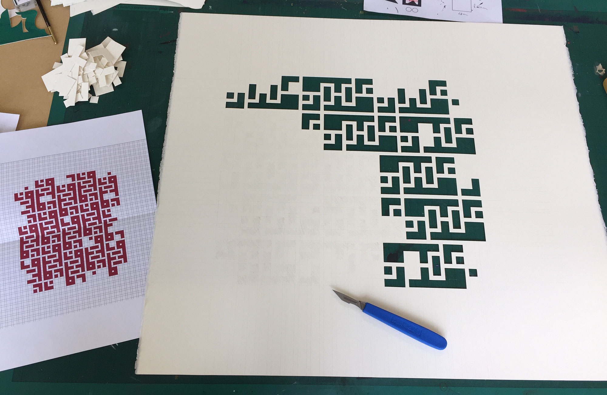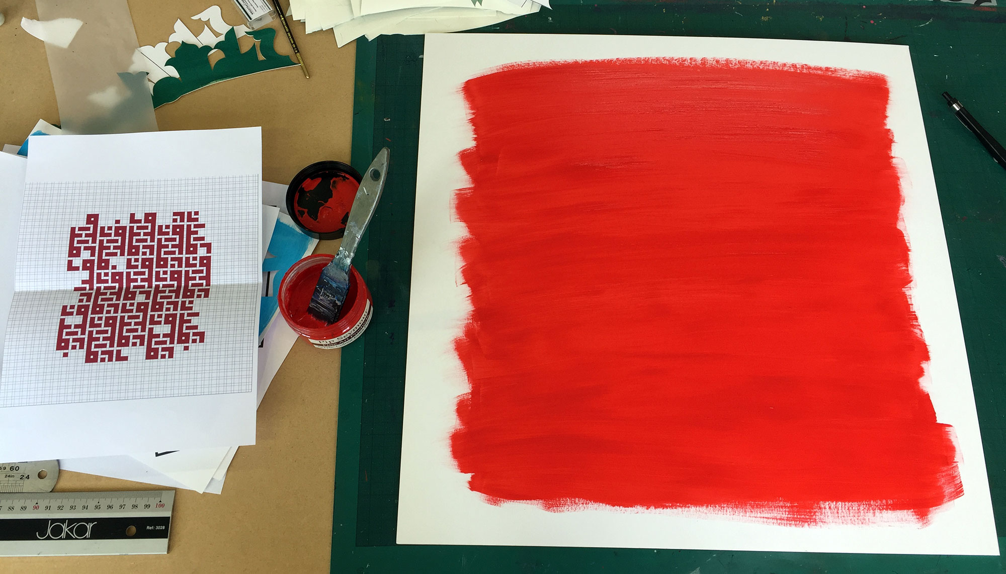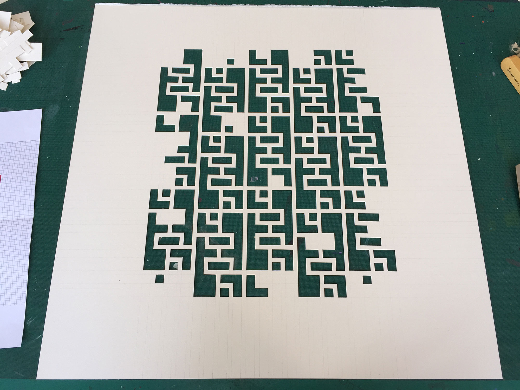 Flight: Chunks of paper are cut out of the gentle pencil grid of peaceful society, and moving away in such a disorderly manner it feels like there has been an explosion. They leave behind a gutted grid, evoking gutted buildings with the red of fire and blood. The more pieces are removed, the more fragile the grid left behind.