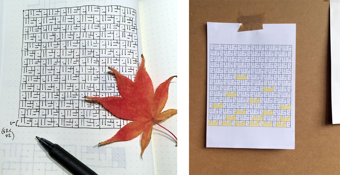 I was moved to work with this word in response to the unmentionable events of last week, and this was my starting point, but the piece revealed itself gradually in the making. First, I realized that once given a Kufi treatment, the word zalâm contained the word diyâ’, which is “light”, as shown here: