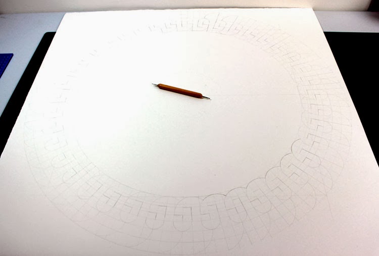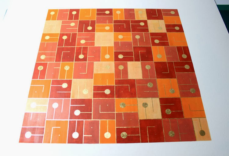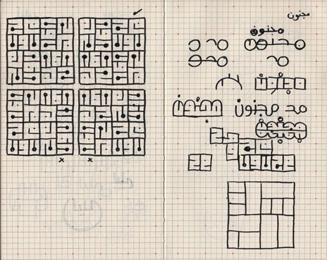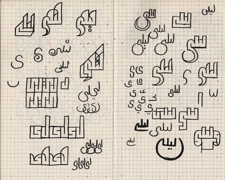 My interest in this theme lies in its archetypal dimension, and how it can be evoked through calligraphy and geometry. Majnoun, despite his representation as a solid masculine square, is broken up, fragmented, deconstructed; mysticism and psychology both agree that a dissolution of the sense of self is the natural consequence of real love, which takes us beyond ourselves. The circle, Layla, is a feminine shape, but also a symbol of the higher Self. She spins or dances in continuous motion, as there is no break in the sequence of letters: ل ي ل ى. Seen separately, these two symbols seem to be polar opposites, yet they are joined in a primordial geometric shape: