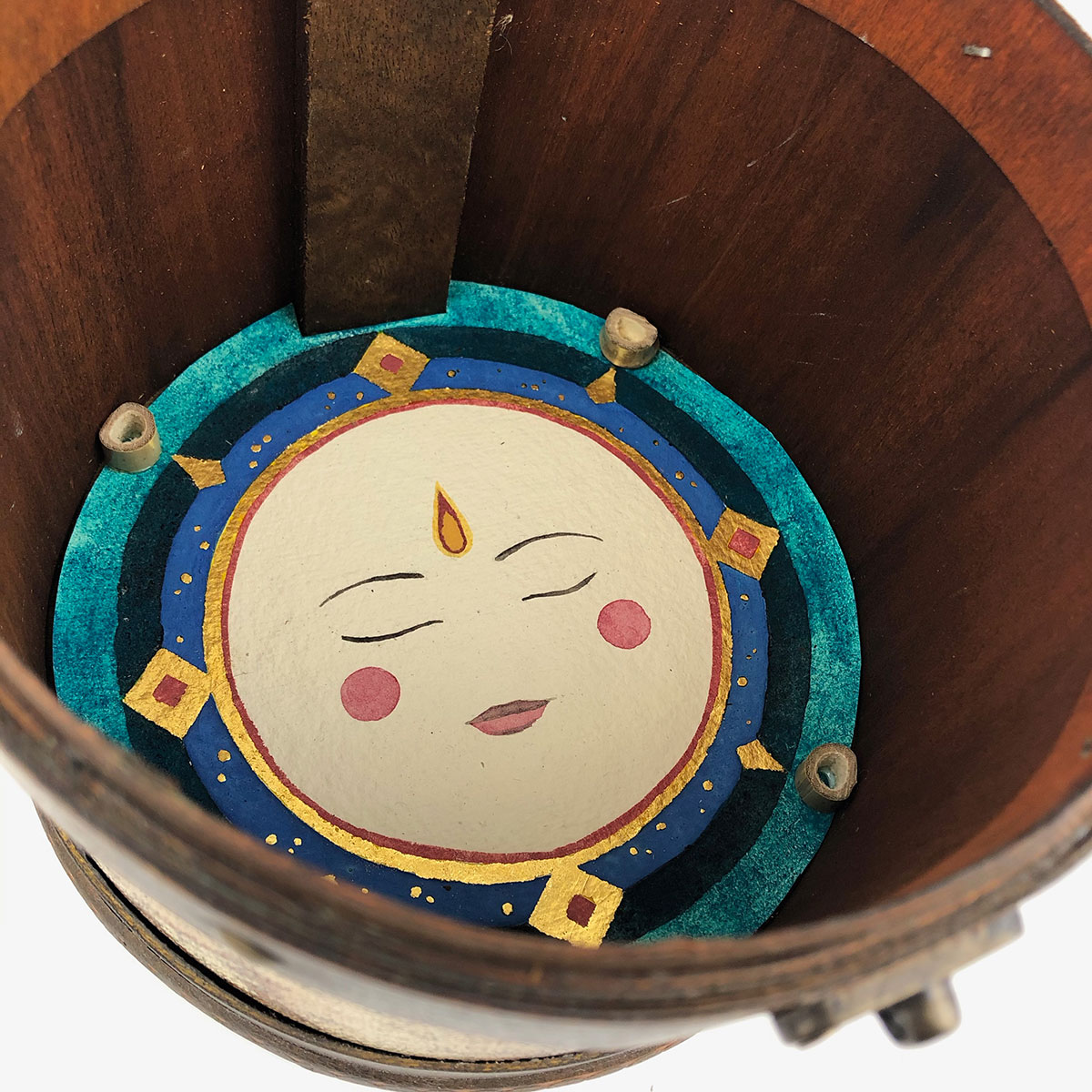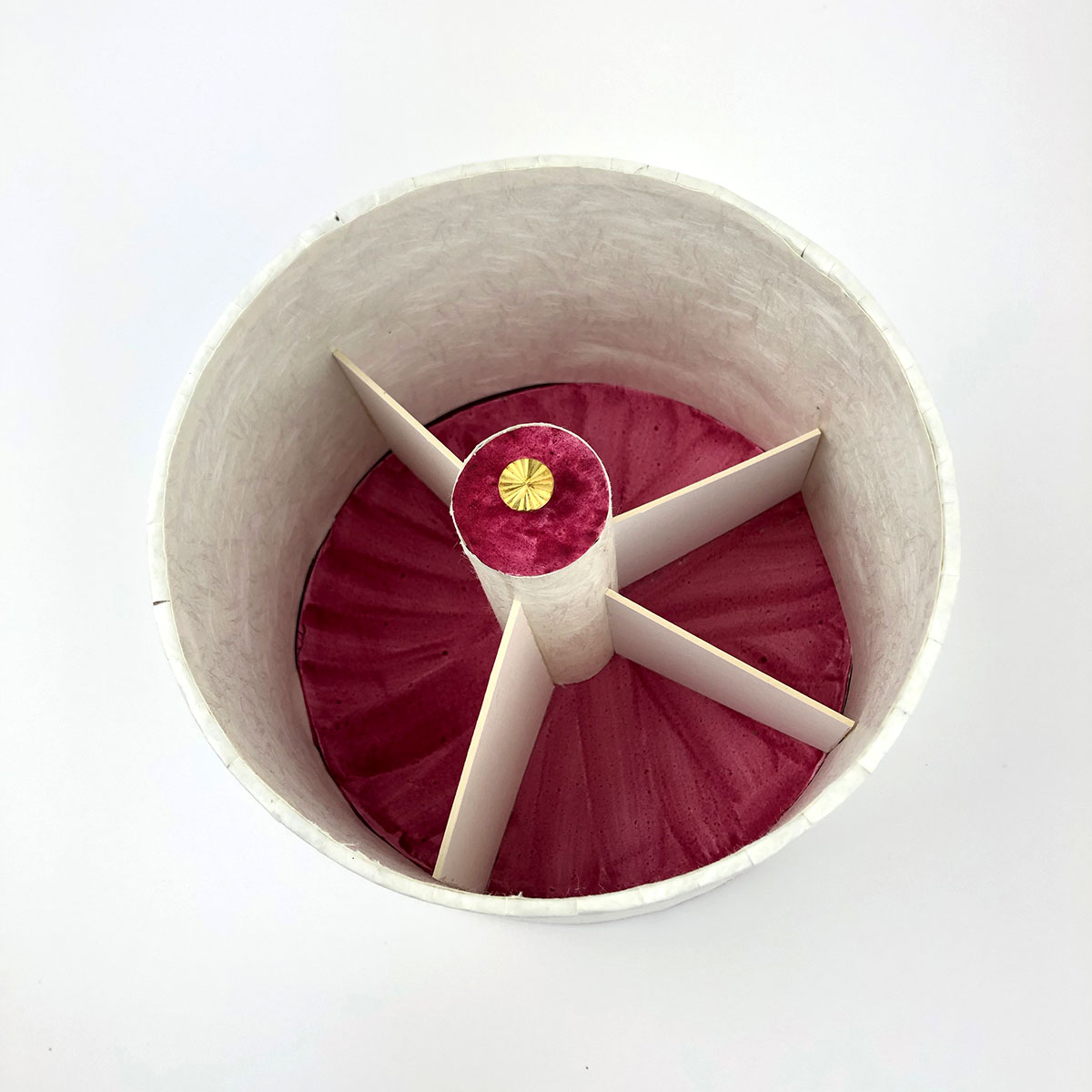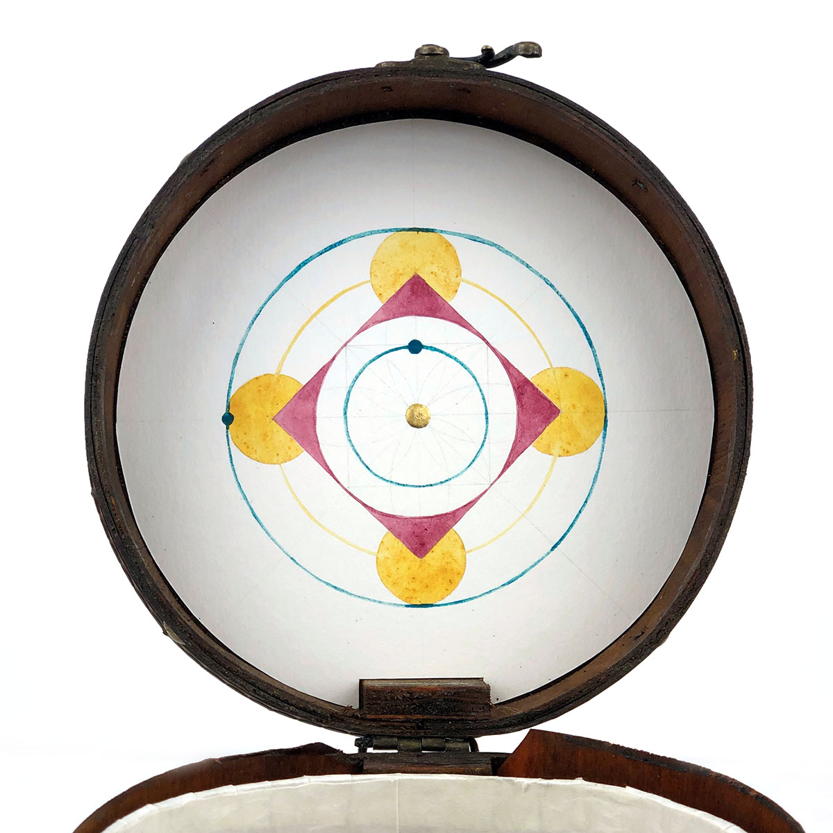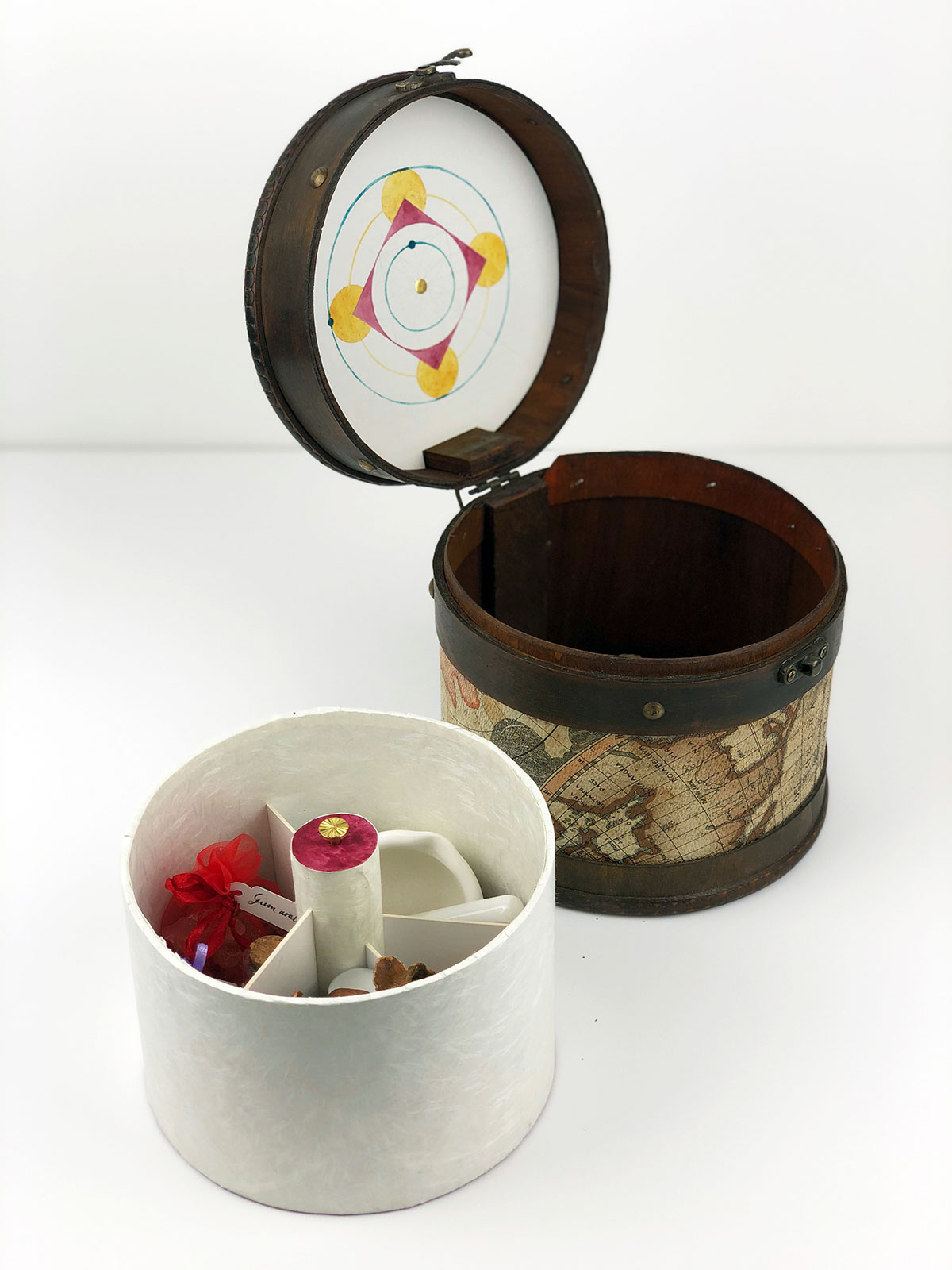 One of 7 planet-themed boxes that were made as groundwork and practice for this collection. They draw both on my work with cosmology and on my study of Abbasid-era art materials, Inks & Paints of the Middle-East. The latter book was included with the boxes and contained the clues for deciphering the contents. One piece of information: Mercury is associated with composite colours and ink made of lac, orpiment and verdigris.