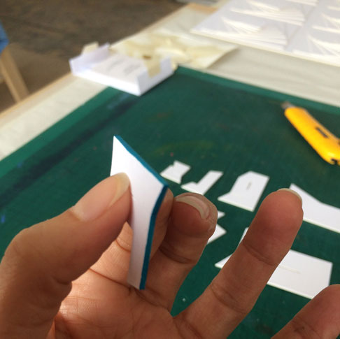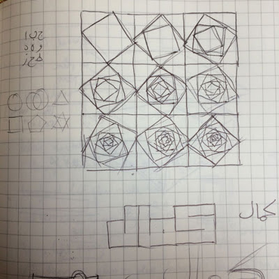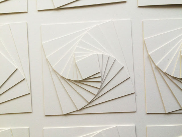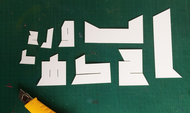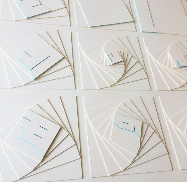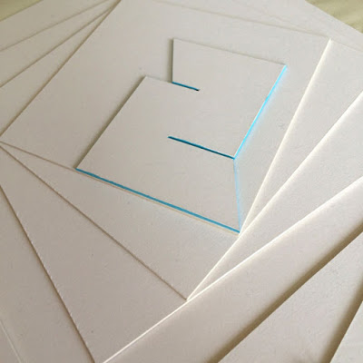The Arabic letters were originally numbers as well, starting with Alif=1 and ending with Ghayn=1000. This puts them in even closer relationship with geometry, which is the unfolding of numbers in space. This piece marks the beginning of an exploration of this relationship, in the medium of cut paper which creates both shadows and highlights. The edge of the letters themselves is painted in increasingly intense turquoise.
