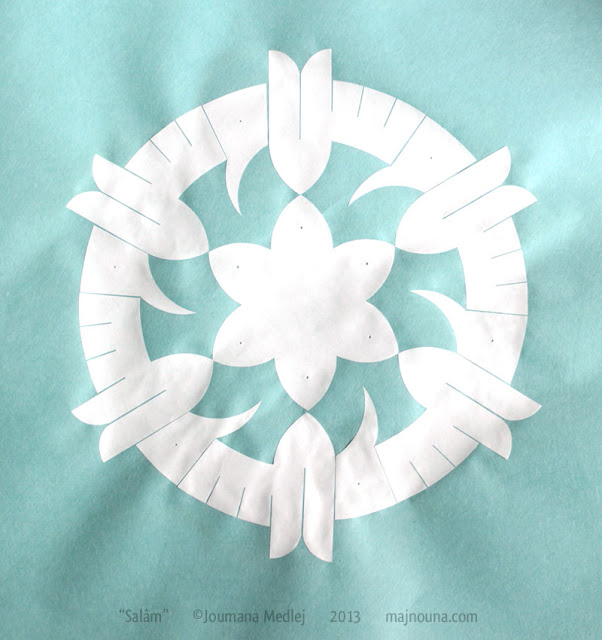 Salâm سلام, translated as Peace, may be the best-known of all Arabic words, but it should not be thought that it corresponds perfectly to its English counterpart: the family of words from the root SLM express soundness, wholeness, safety, trust, surrender. The derived adjectives describe a state of being proper, sound, unblemished, uninjured. and even perfect. For this reason my design is six-fold and displays at its heart a basic construction of six-fold geometry: 6 is regarded as “the perfect number”, and its symbolism fits closely.
