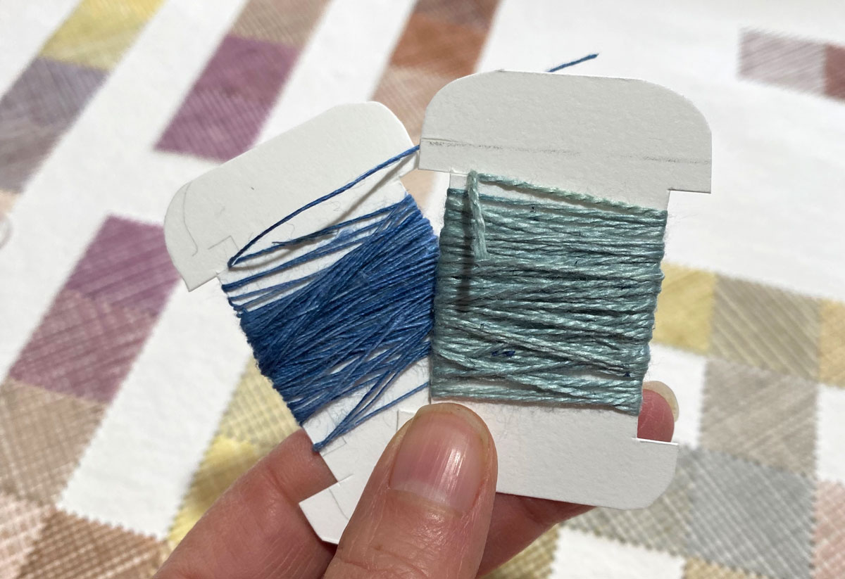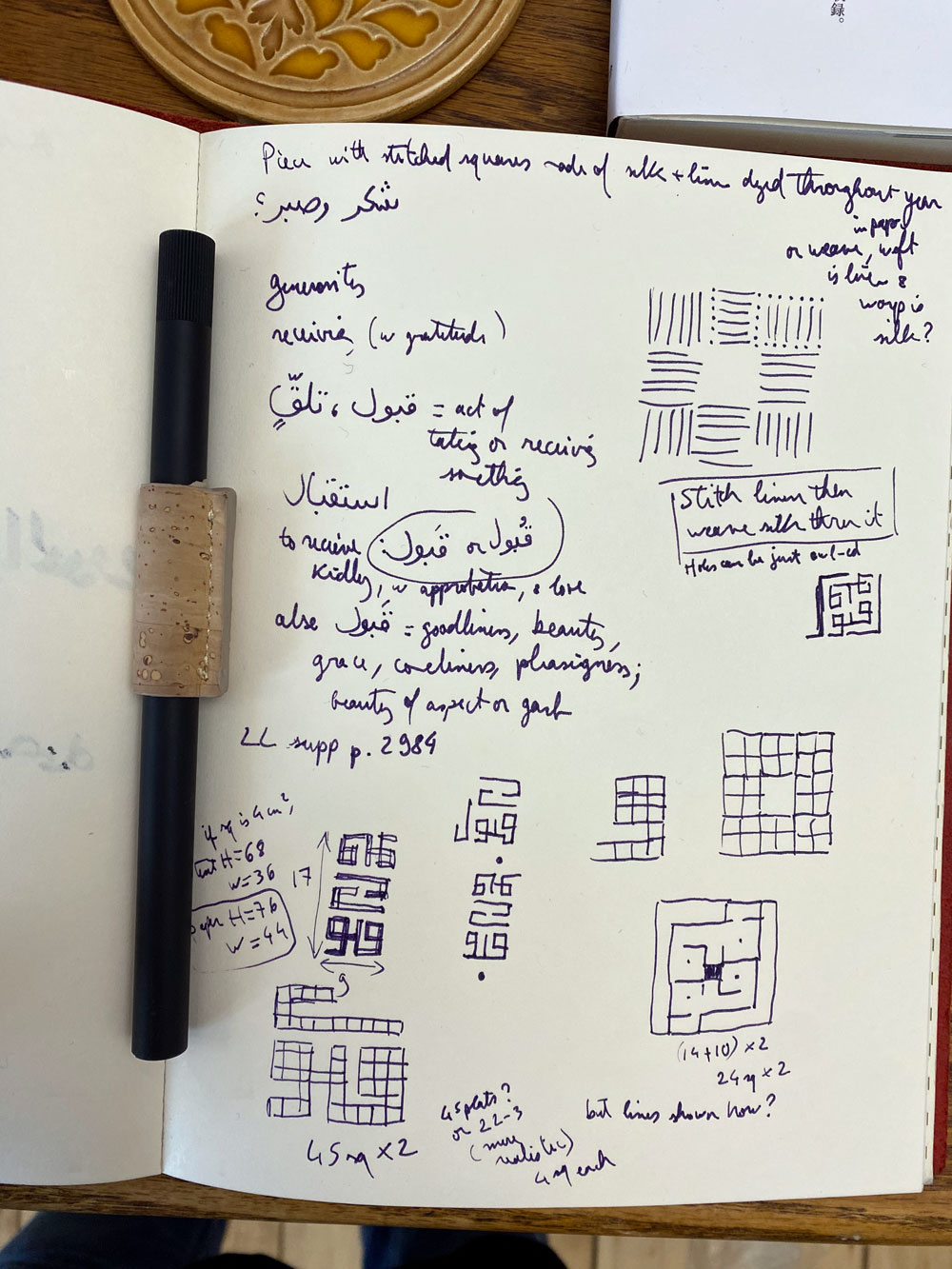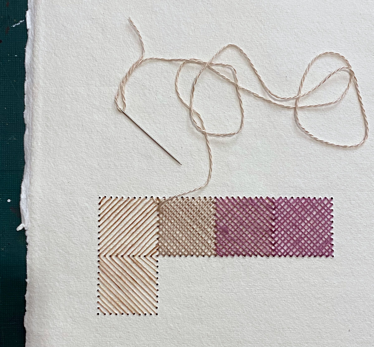 Over several months, I used plant matter as it presented itself to me to dye threads of silk and linen, without expectation. I then stitched them on paper in the order I found them. Between the viewing angle and the glossy nature of the silk, the colours are ever-changing and can’t be pinned down. The overall composition is a double instance of Qubūl, which reflects the original Japanese concept to express my gratitude to the plants, but also to Life for what it has given me this past year.