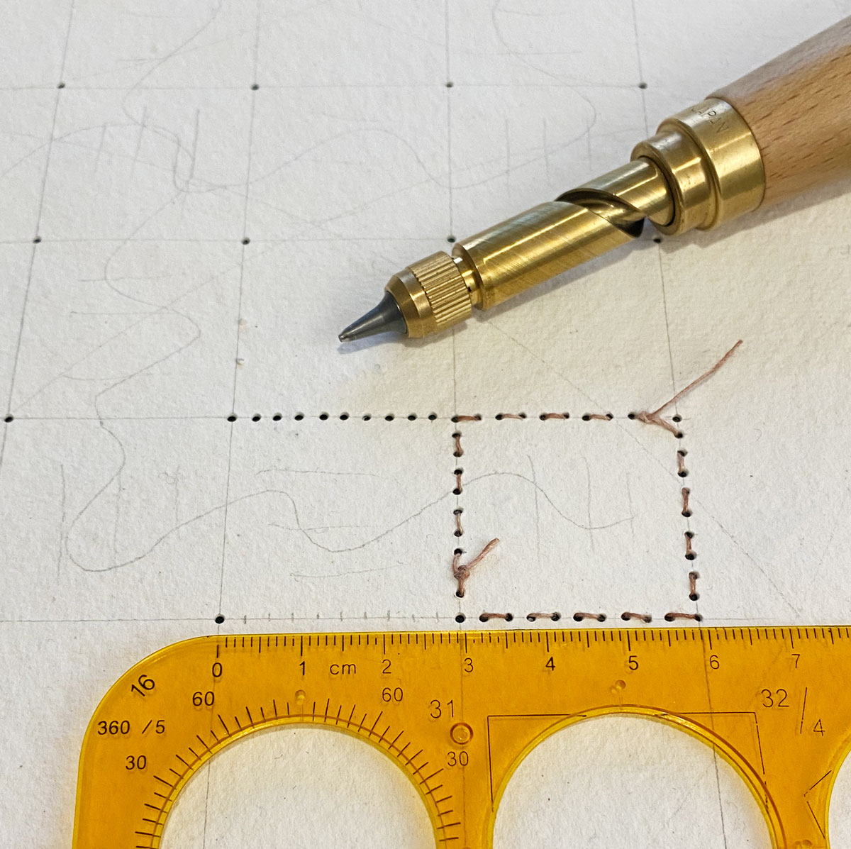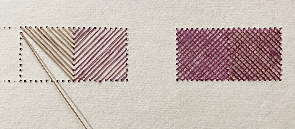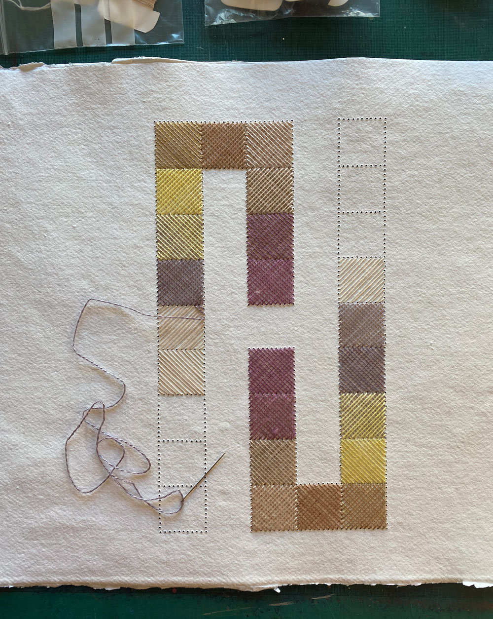 The stitching started at the centre, tracing the letters backwards in both direction. Each skein was used for two squares, but the underlayer (linen) and top layer (silk) plants used are shifted so that every other square overlaps with a potentially contrasting hue. In this way some unexpected and constantly shifting optical mixes are achieved.