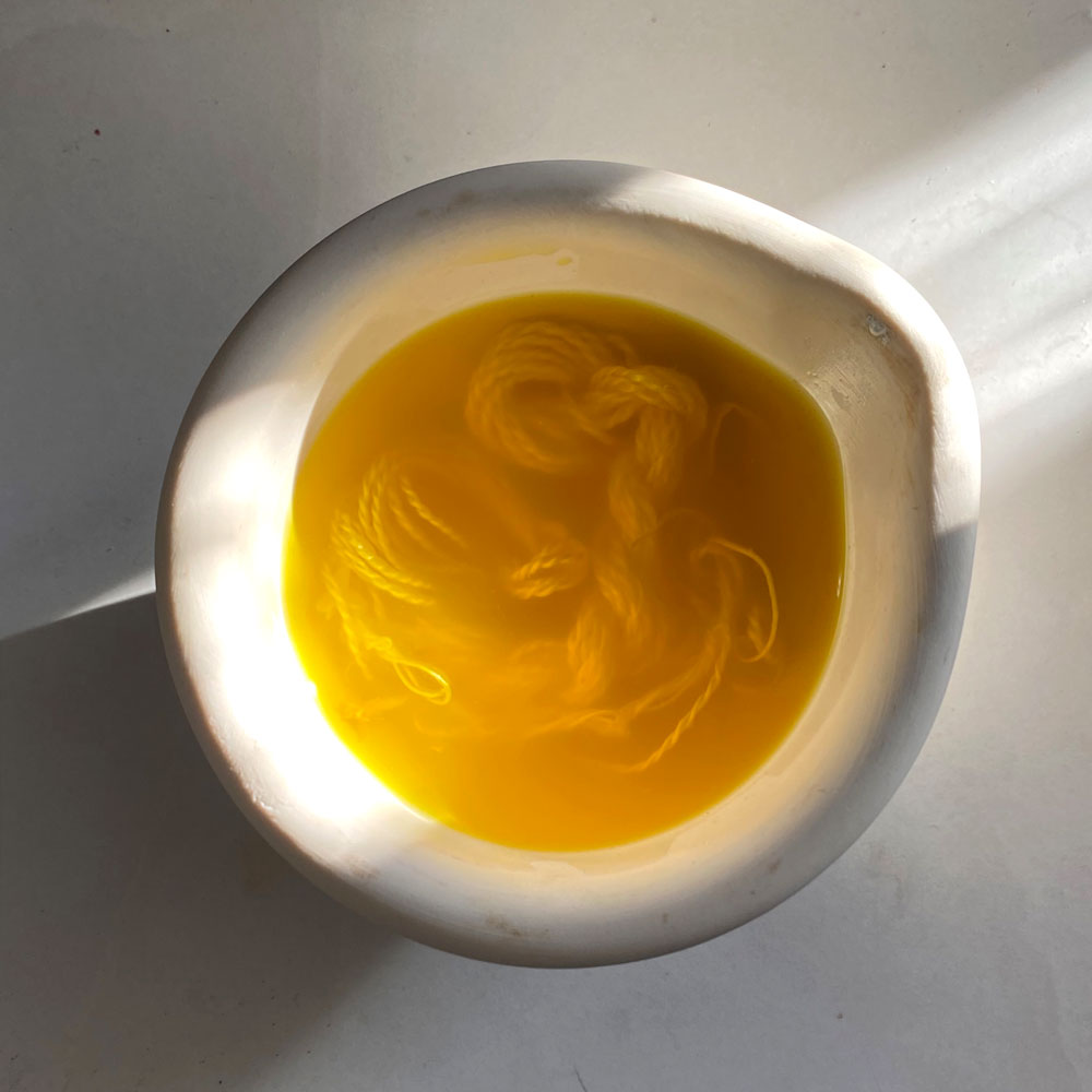 This piece was inspired by the work and above all the philosophy of Fukumi Shimura, Japanese dyer and weaver, who speaks about Kusakizome (dyeing with plants) being an act of “receiving colour”. This passage in particular resonated with me deeply: