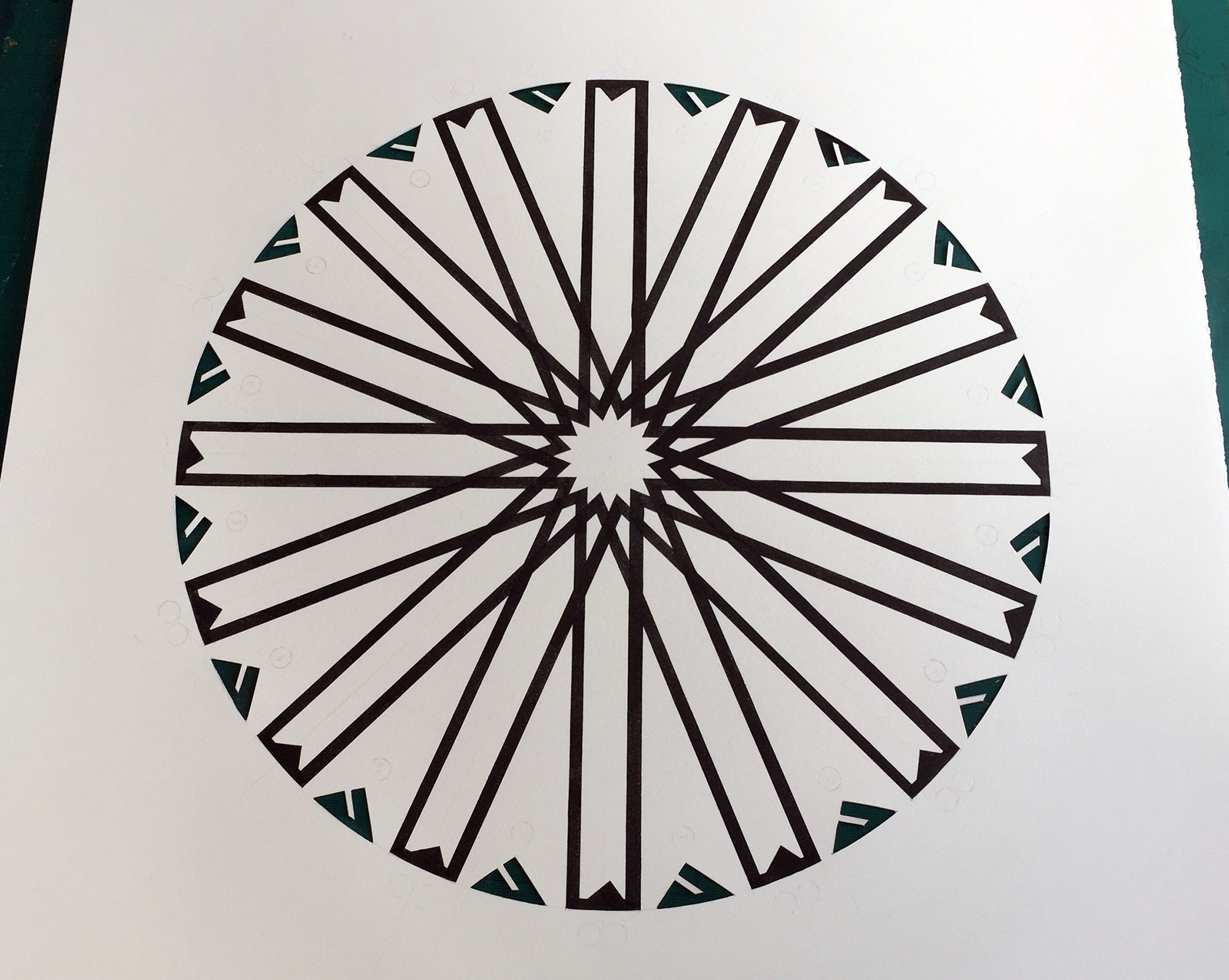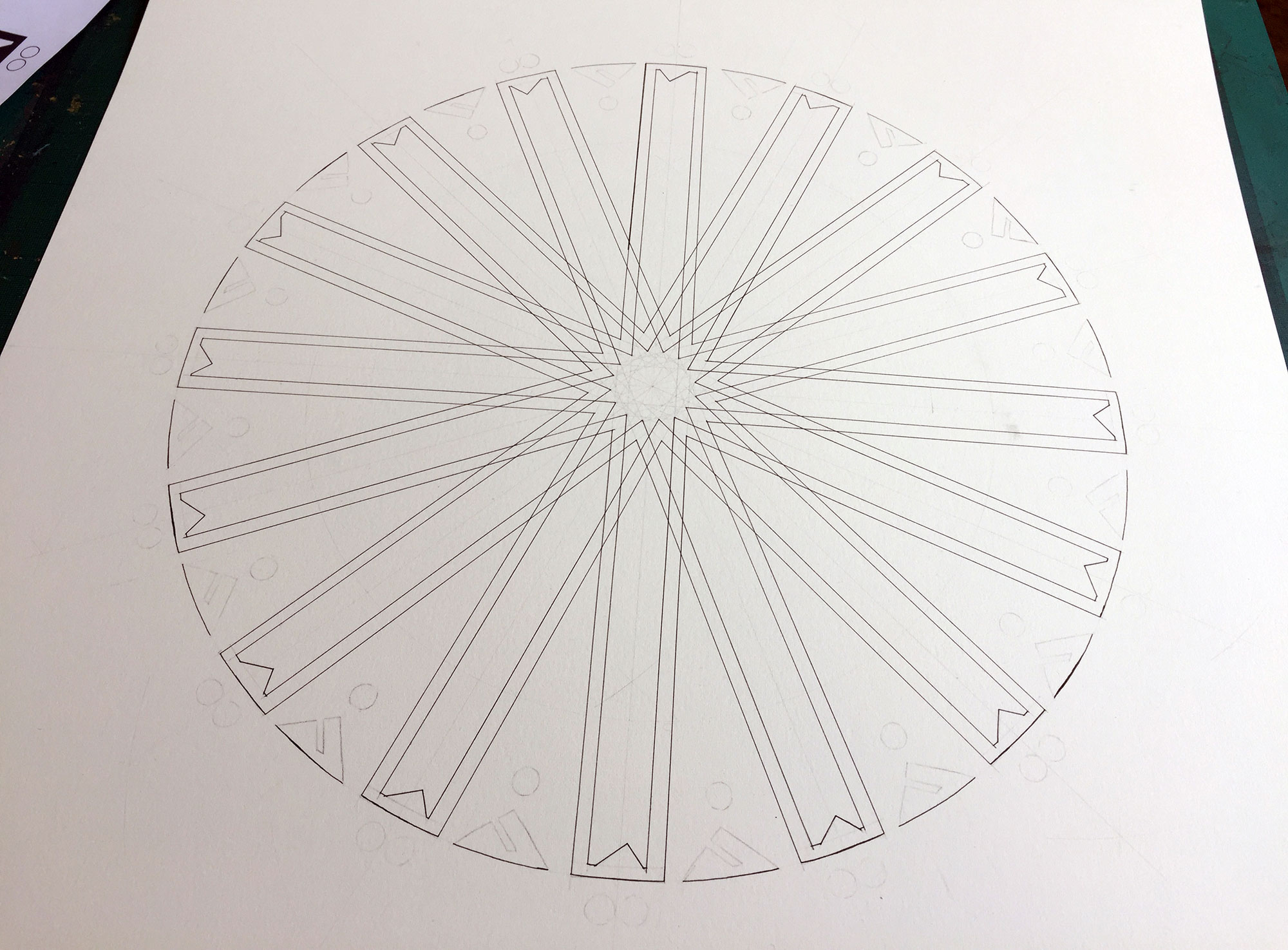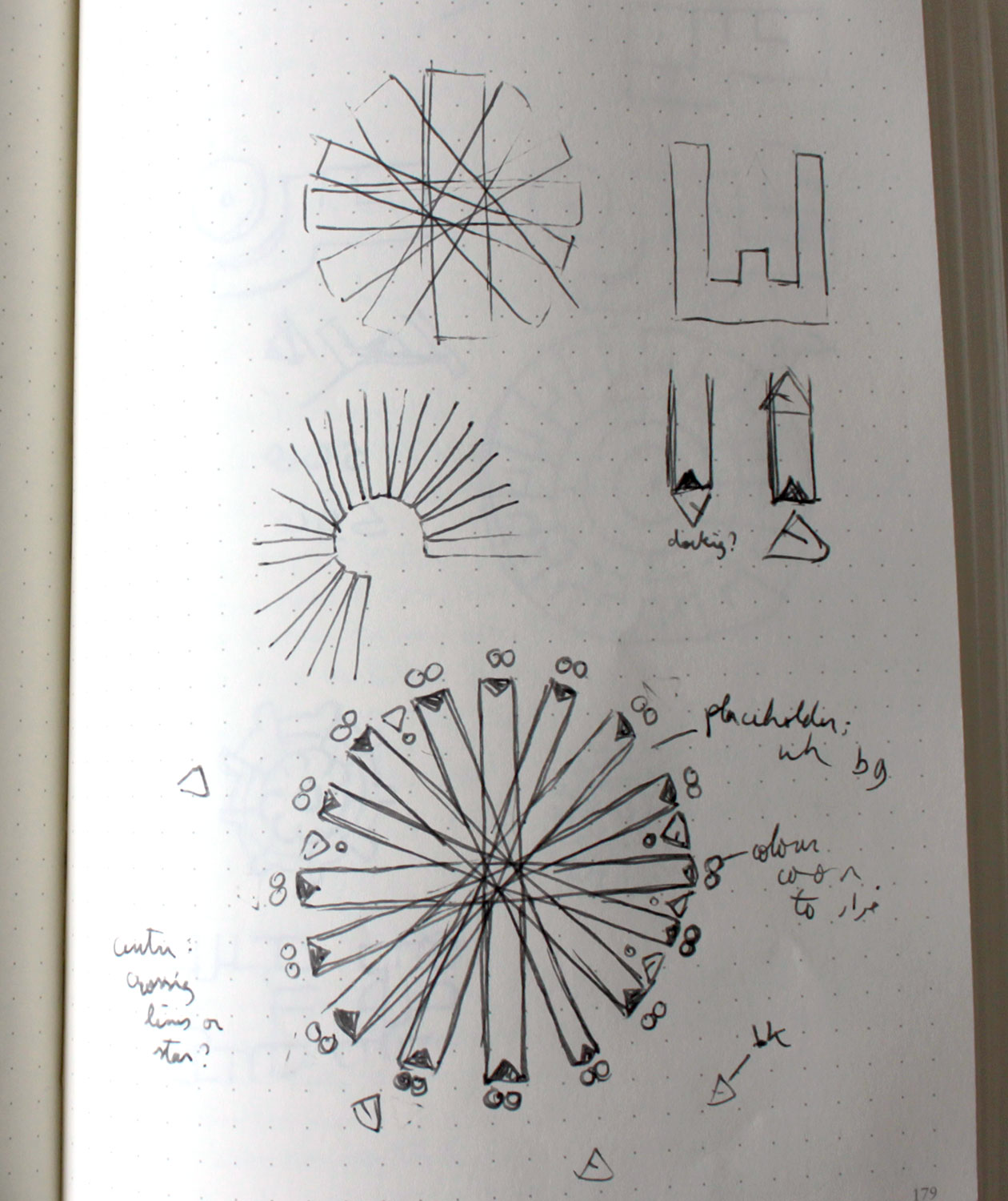 Refuge: Liyâdh evokes to me ships finding a safe harbor: this is expressed here with lost letters finding a space to moor – a space that is available and reserved for them (in simpler days, an empty space was always left at the table for the unexpected guest in need). The fragmented space of Flight has given way to the circle of wholeness. The previously threatening red now radiates at the heart of the composition like a warm sun or hearth fire.