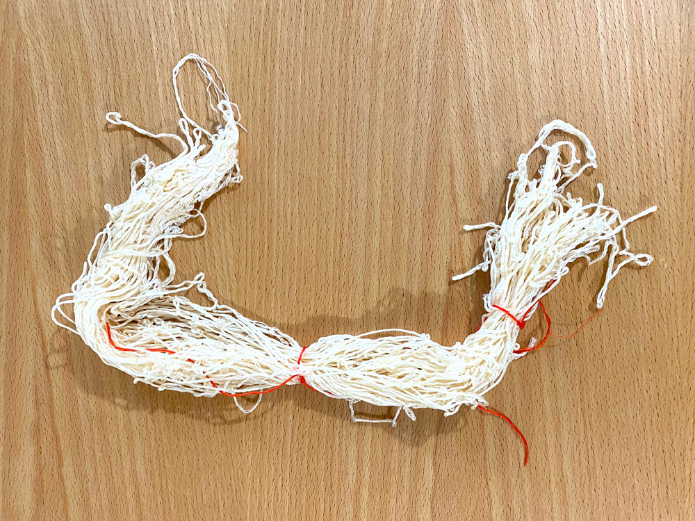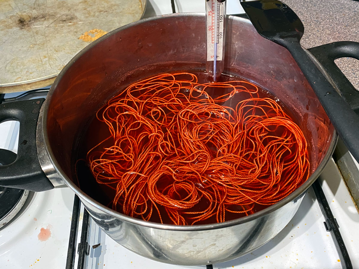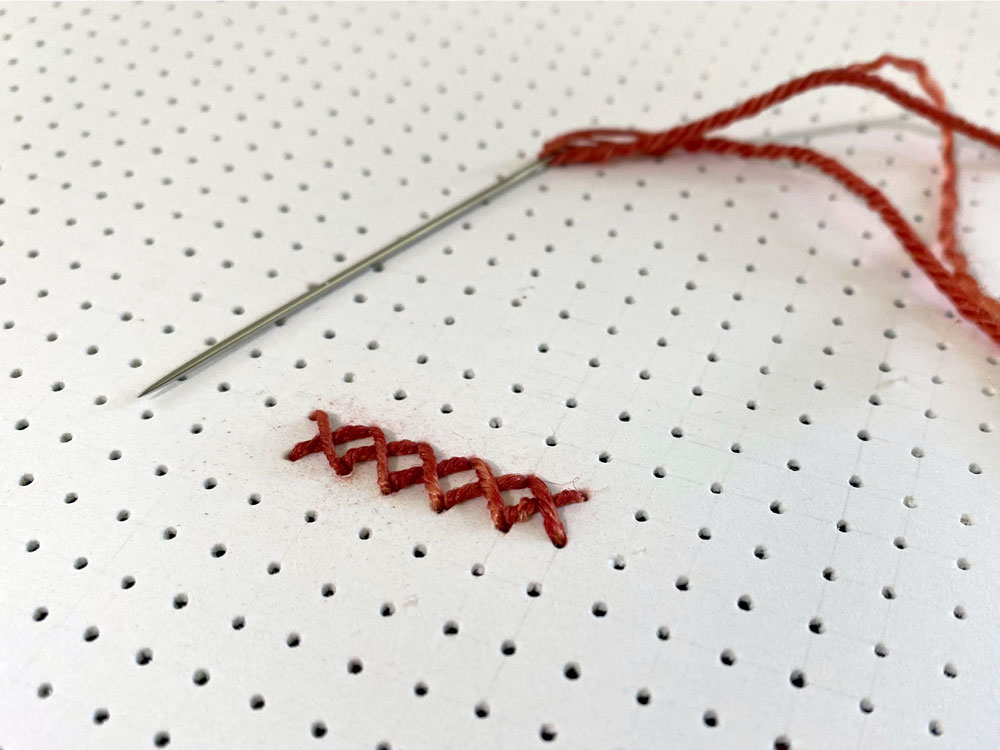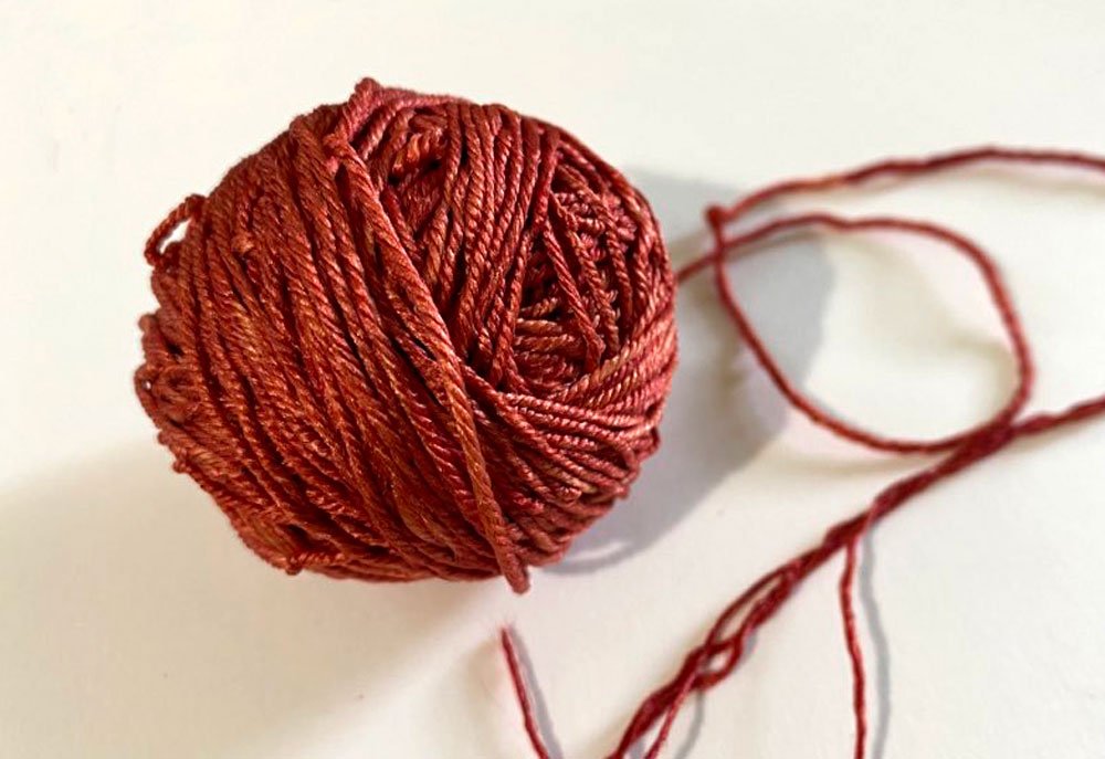 However, this piece was really lead by an impulse to dye thread and work stitches on paper, as the ideas of “thread”, “unraveling”, weaving together”, “threadbare” and other textile-based metaphors have been on my mind. To create this, I dyed 3-ply silk thread with madder root, and used an iron modifier to achieve the darker brown. As I had only a limited quantity of red silk to work with, I only darkened short lengths as they were needed, and as a result the shades are not identical. The result is strikingly reminiscent of lived-in and loved textiles that are repaired and re-embroidered over time, so that they show fresh colours alongside older and faded ones.