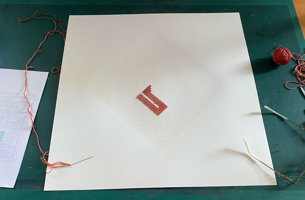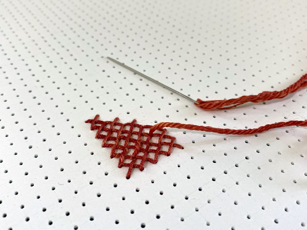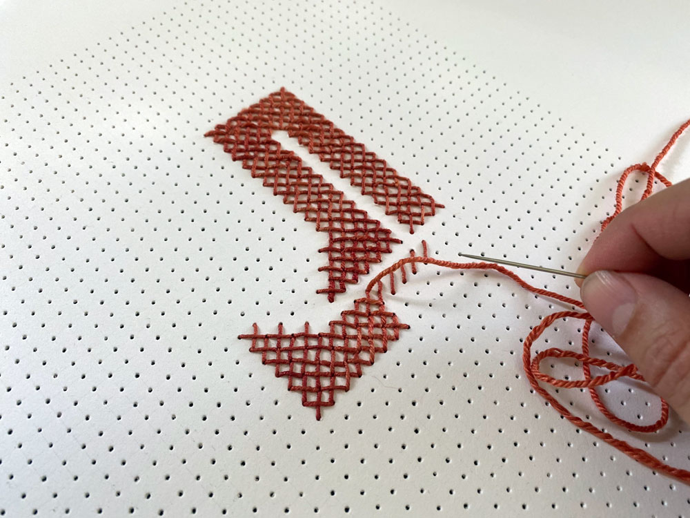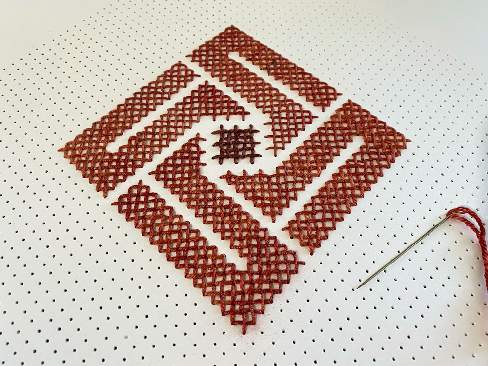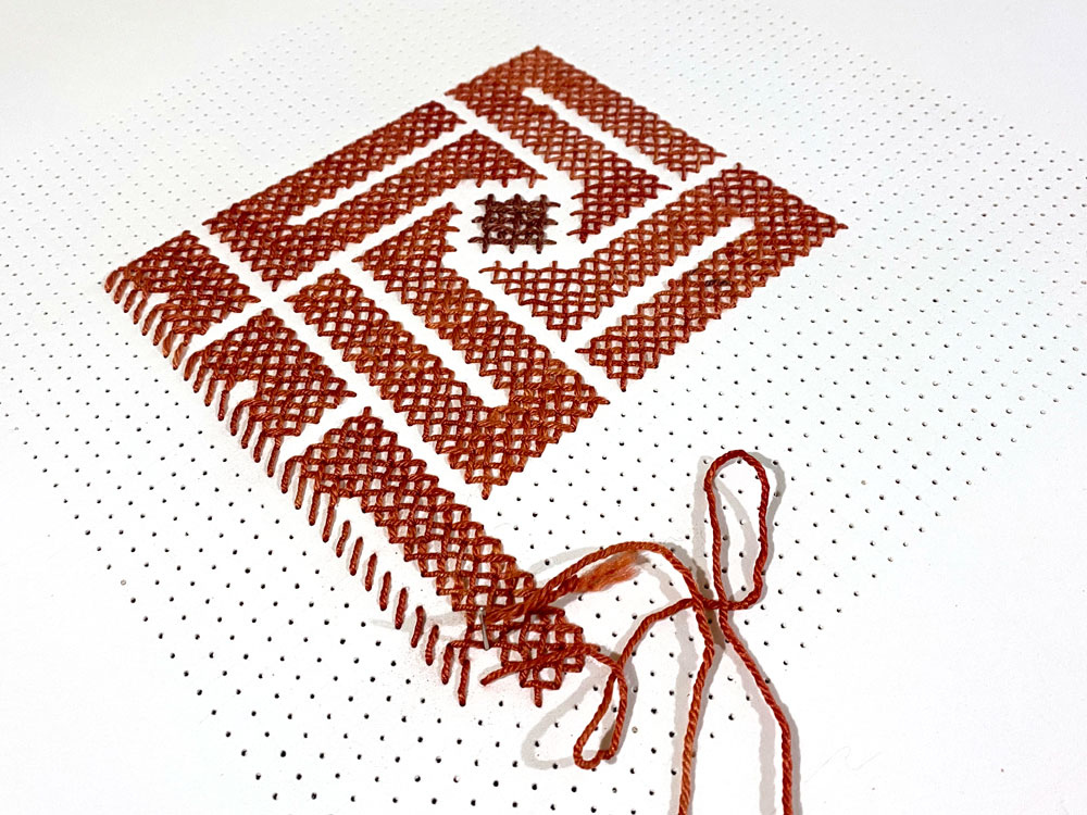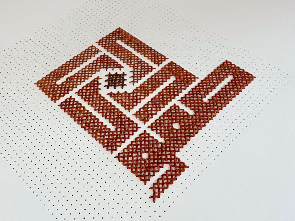 My choice of stitching for this piece is unsurprisingly inspired by the Palestinian tradition of tatreez (cross-stich embroidery), which in its deep connection to identity has long become, not merely a symbol for, but an act of resilience. It was also practiced in Lebanon at least as early as the medieval period, so there’s a personal connection there (though Lebanese tatreez fell out of use so long ago hardly anything is known about it).