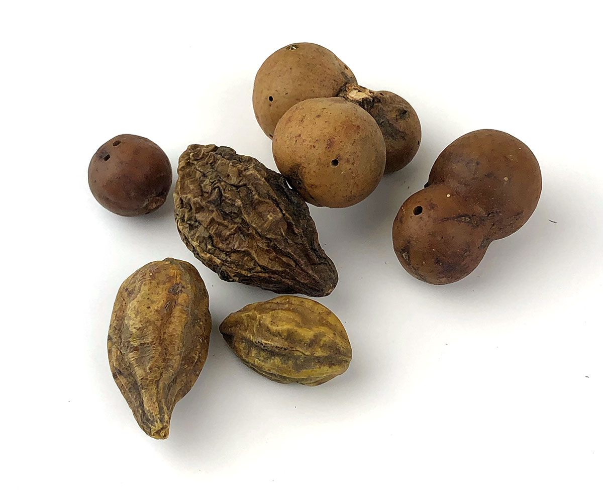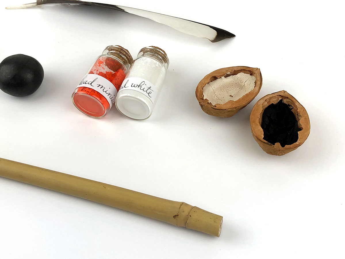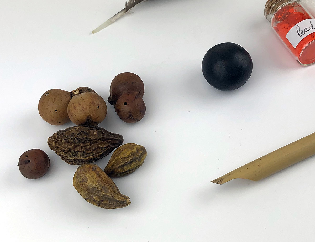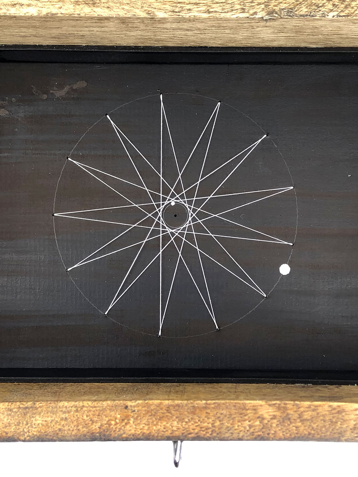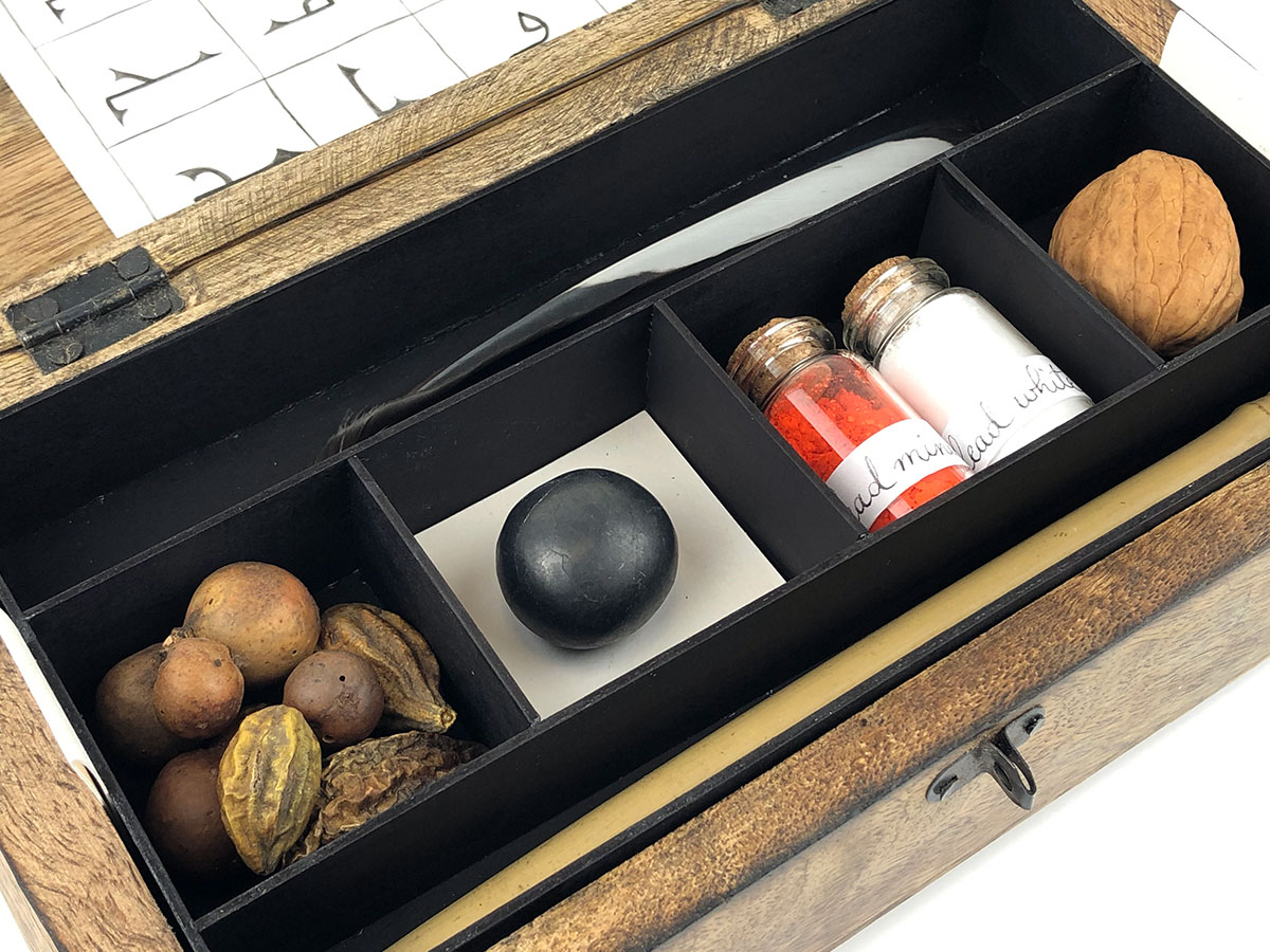 One of 7 planet-themed boxes that were made as groundwork and practice for this collection. They draw both on my work with cosmology and on my study of Abbasid-era art materials, Inks & Paints of the Middle-East. The latter book was included with the boxes and contained the clues for deciphering the contents. One piece of information: Saturn is associated with black and lead.