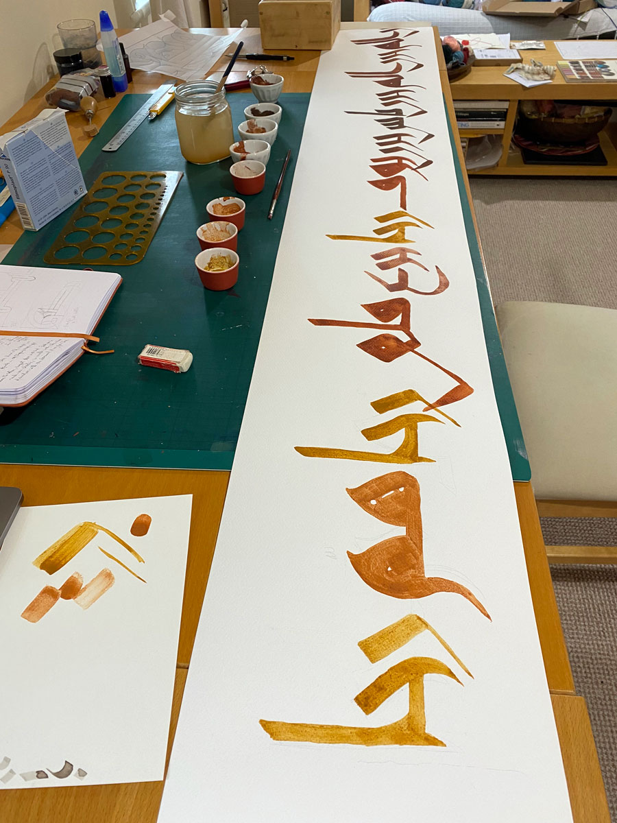 In contrast, the verso is based on the script of the “Nurse’s Qur’an”, which is a bold, coarse and rather chaotic take on the refined Eastern Kufi styles. It’s written using eight tones of earth pigments foraged in Lebanon, increasingly dark and mud-like (note also they are iron oxides, connected to blood). I used an extra layer of egg tempera as varnish so the pigments wouldn’t rub off too easily onto the recto; nevertheless this happens a little as we approach the end of the scroll, which feels appropriate as repressed emotions cannot altogether be stopped from contaminating one’s facade.