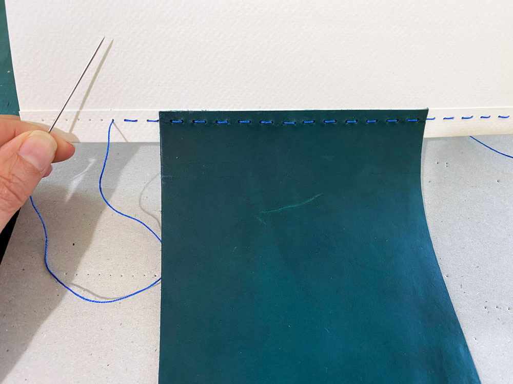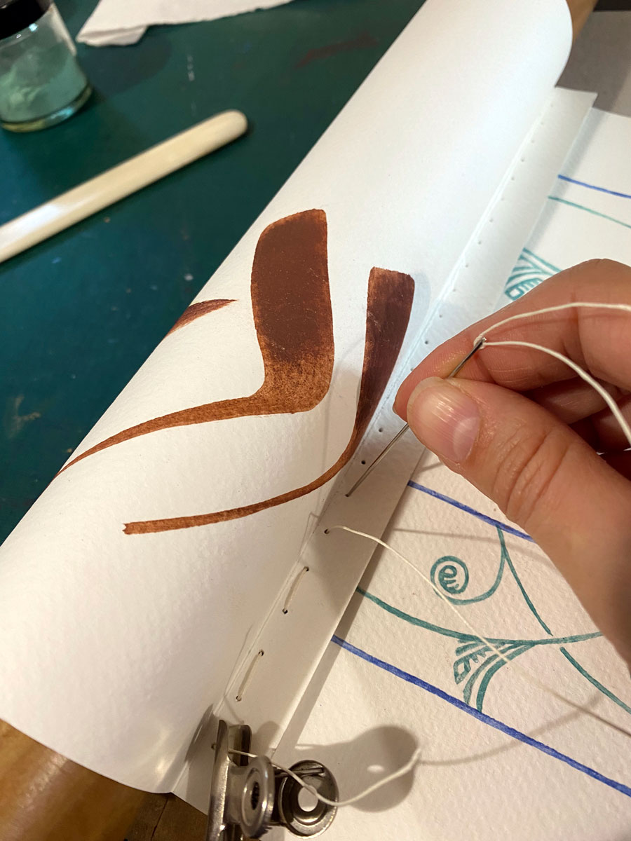 The design on the recto is based on stucco panels of Alhambra featuring Kufi calligraphy and biomorphic patterns, painted here with lapis lazuli and a mixture of azurite and chrysocolla as I wanted a very cool overall tone.