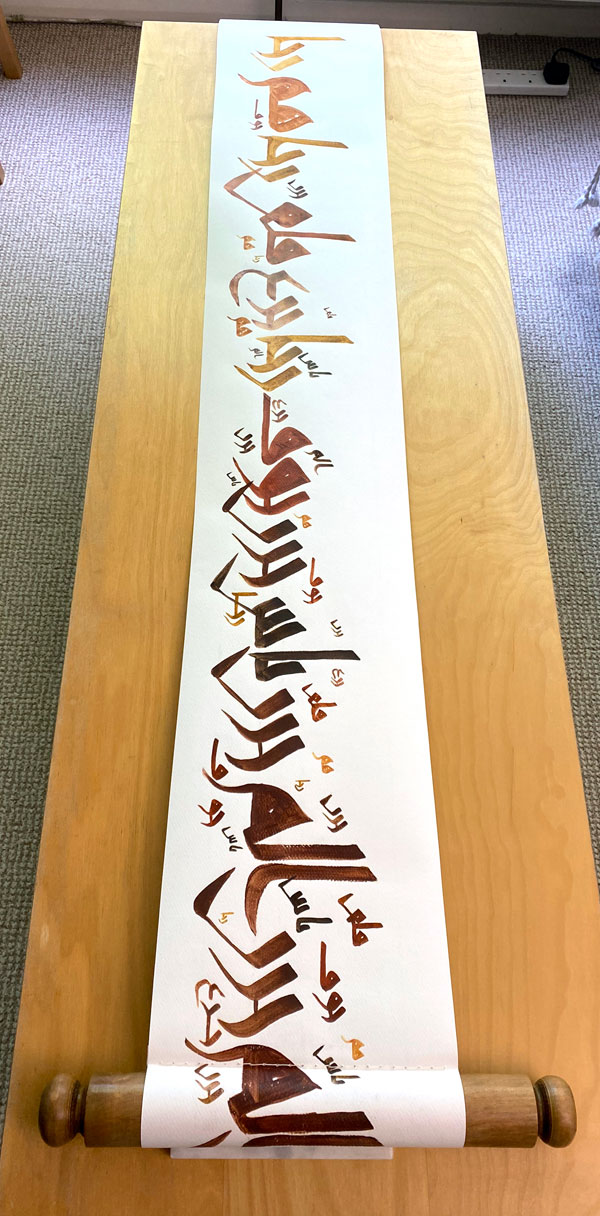 This scroll opens to read Patience صبر repeated in a light and delicate composition. Yet as it’s rolled out, a different text starts showing on the reverse, in a much rougher script. The words, which can only be glimpsed, start with expectant hope رجاء and progress through different states of anxiety قلق همّ and fear خوف جزع to despair يأس. They get darker as they multiply along the way, while the recto shows no change.