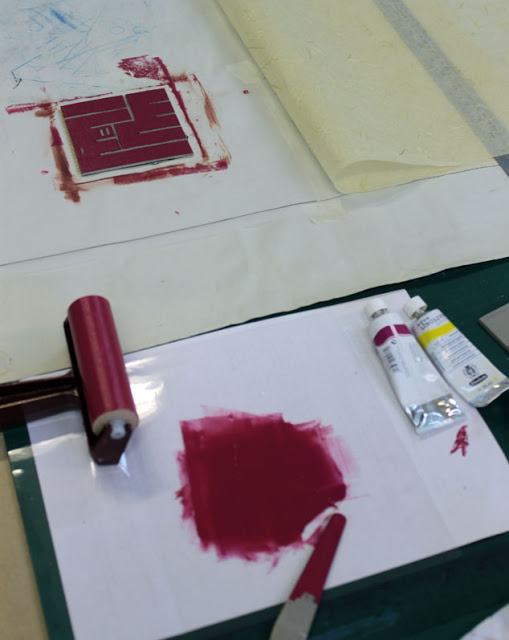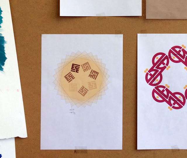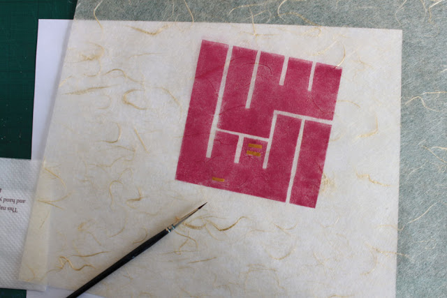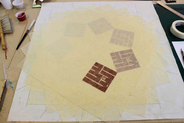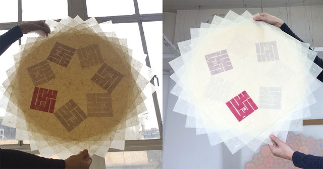 I used layers of Japanese paper stamped with the design: they are 7 in number, to symbolize the 70,000, and assembled so as to form a 7-sided geometric figure. Due to the layering, not all parts of the figure are equally visible, so that the pattern seems incomplete at first glance.