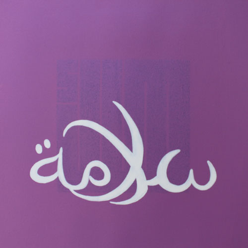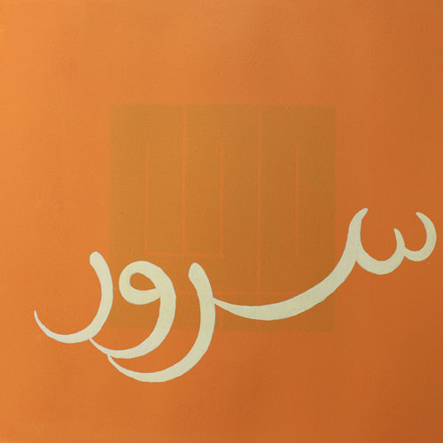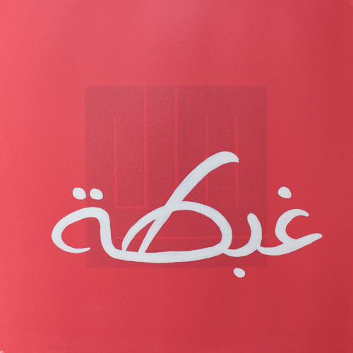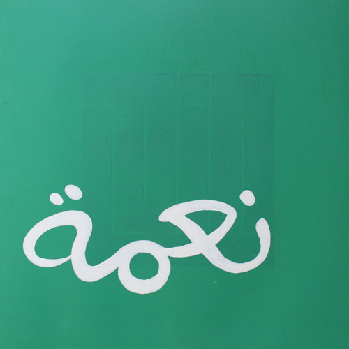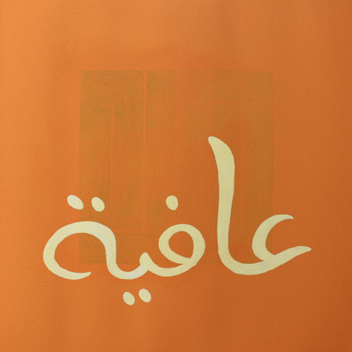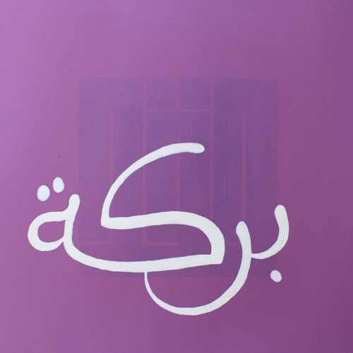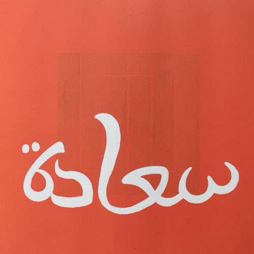 At first sight, this pleasant composition appears to be a colourful take on the traditional blessings that are displayed in homes (health, delight, happiness…), in a freehand script of Maghribi inclination. Yet, barely discernible behind the bright colours, something dark and looming calls for a closer scrutiny. We discover then, behind the cheerful facade, the shadow of words of an entirely other register: greed, violence, pain…