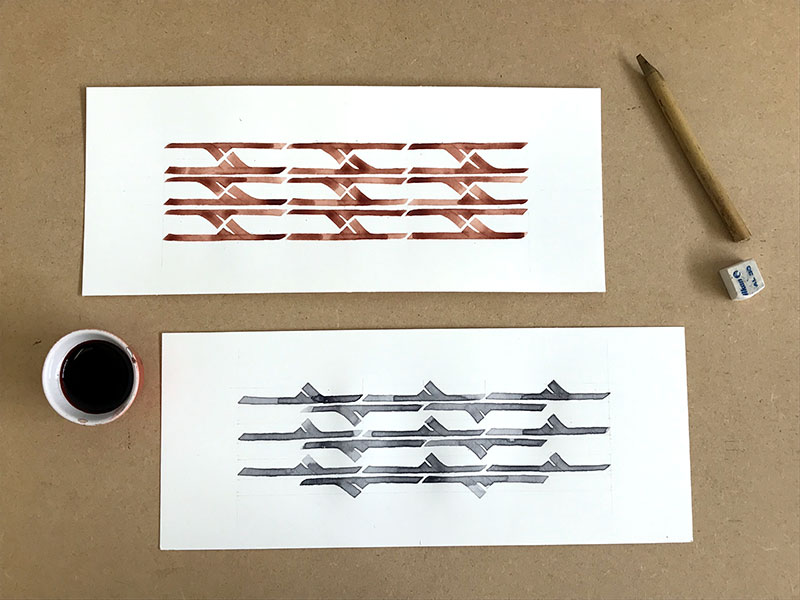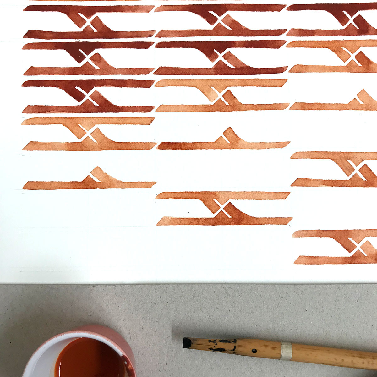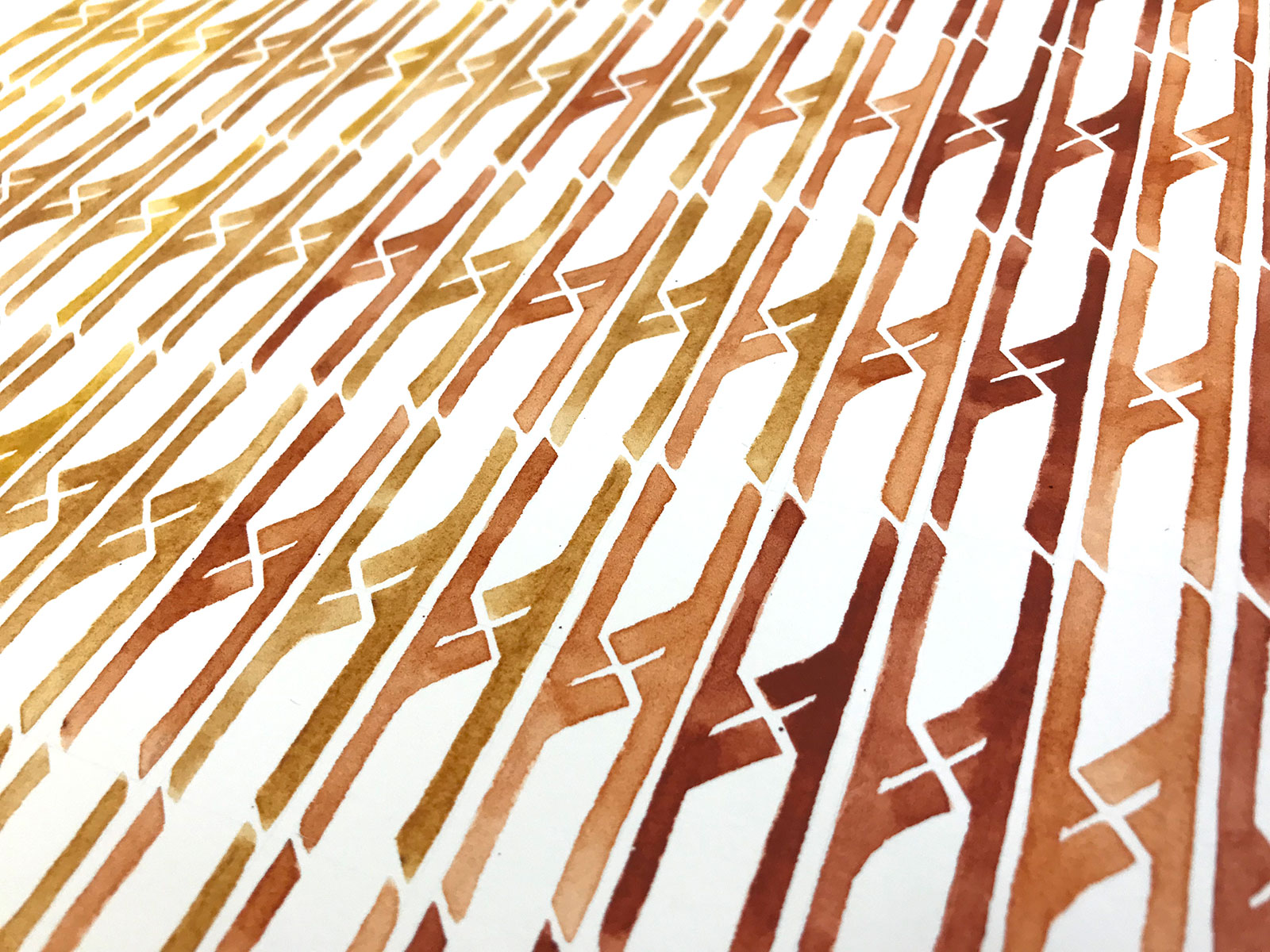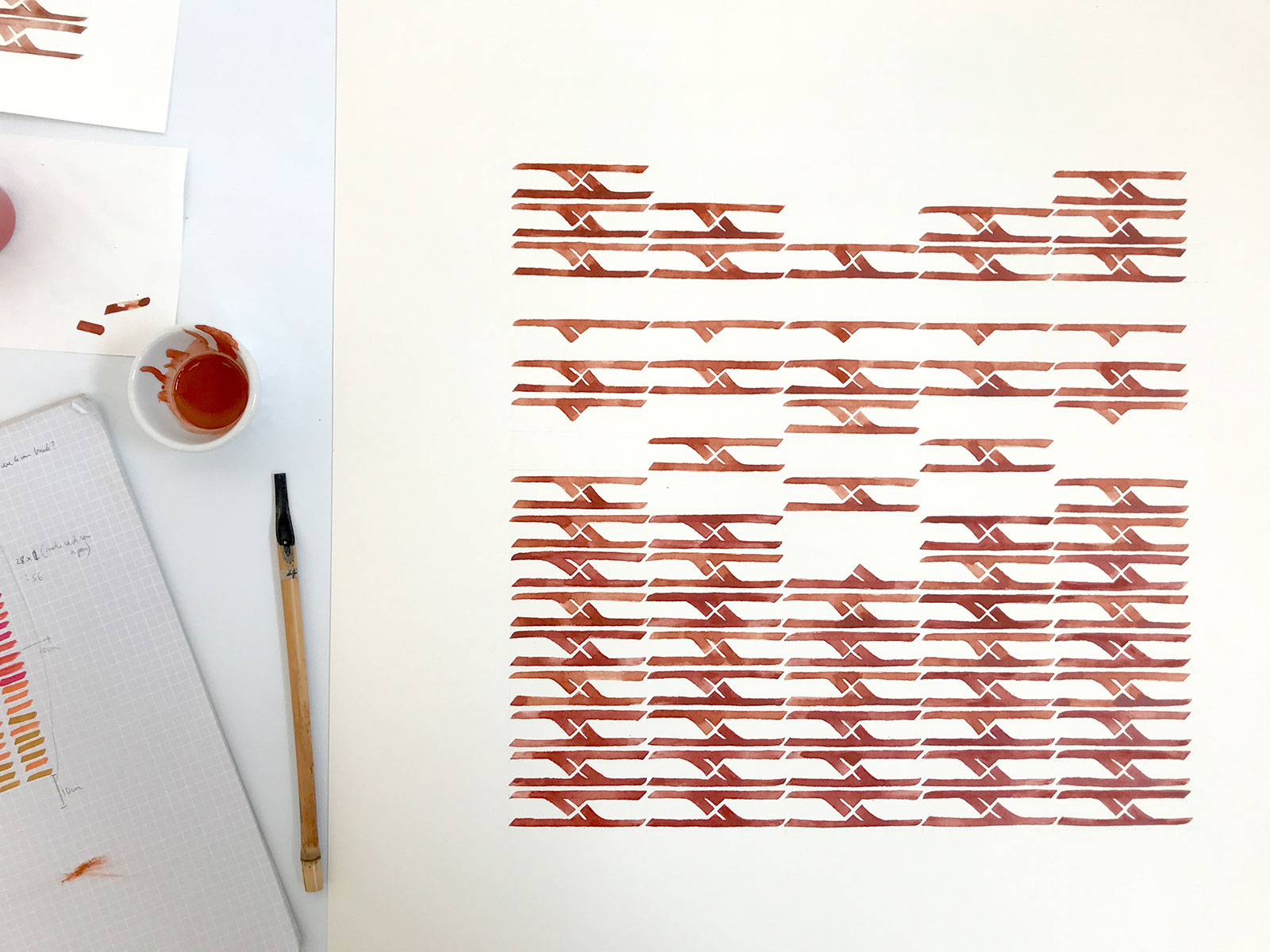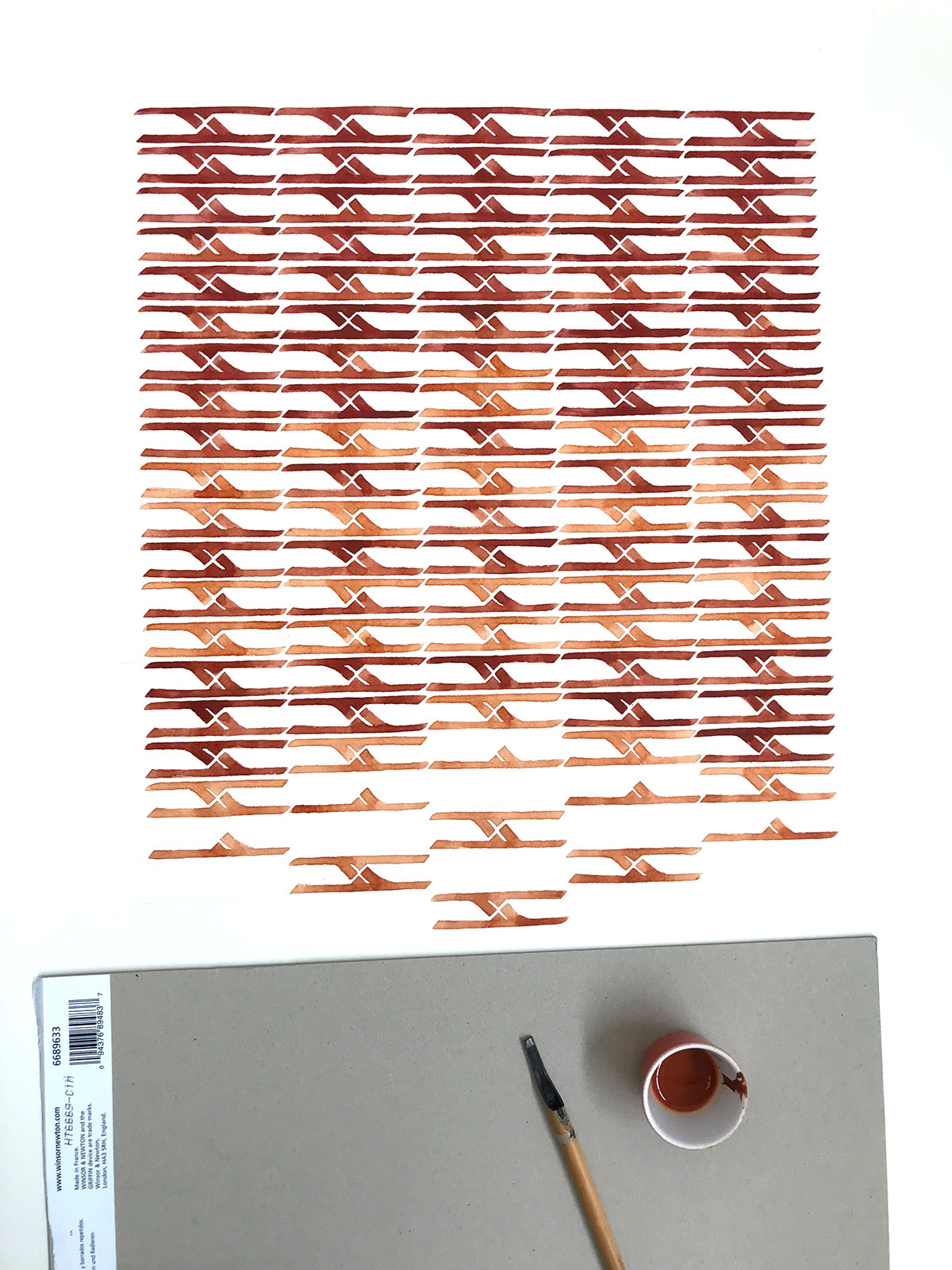 Behind the apparently basic repetition lies a rather complex, changing pattern to create a seemingly organic gradation of hues, rather than a clear-cut organization. The pigments themselves declined to behave predictably, blending or contrasting with their neighbours as they fancied; the natural colours taking my original plan into their own hands to return a piece of surprising radiance, considering it is basically painted with soil.