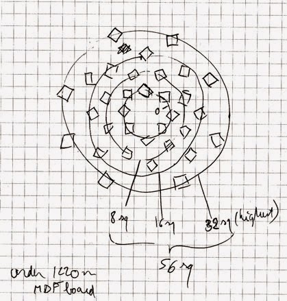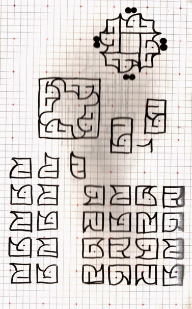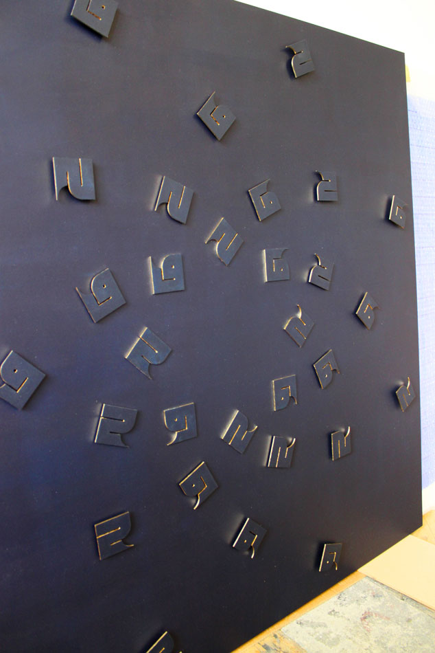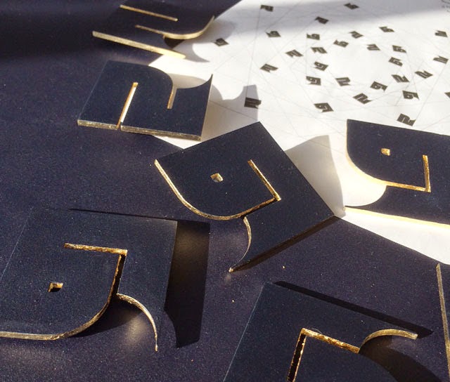 “Truth Without Form” is a Sufi expression also found in Buddhism. Here the word Truth, Haqq (which happens to be one of the Divine attributes) is deconstructed into its two component letters, made into the same shape, and scattered widely on a background with which they blend. But a hidden form can be guessed behind the apparent randomness, and a change of perspective makes the letters appear sharply as their golden edges are revealed… Forms hidden over a hidden form.