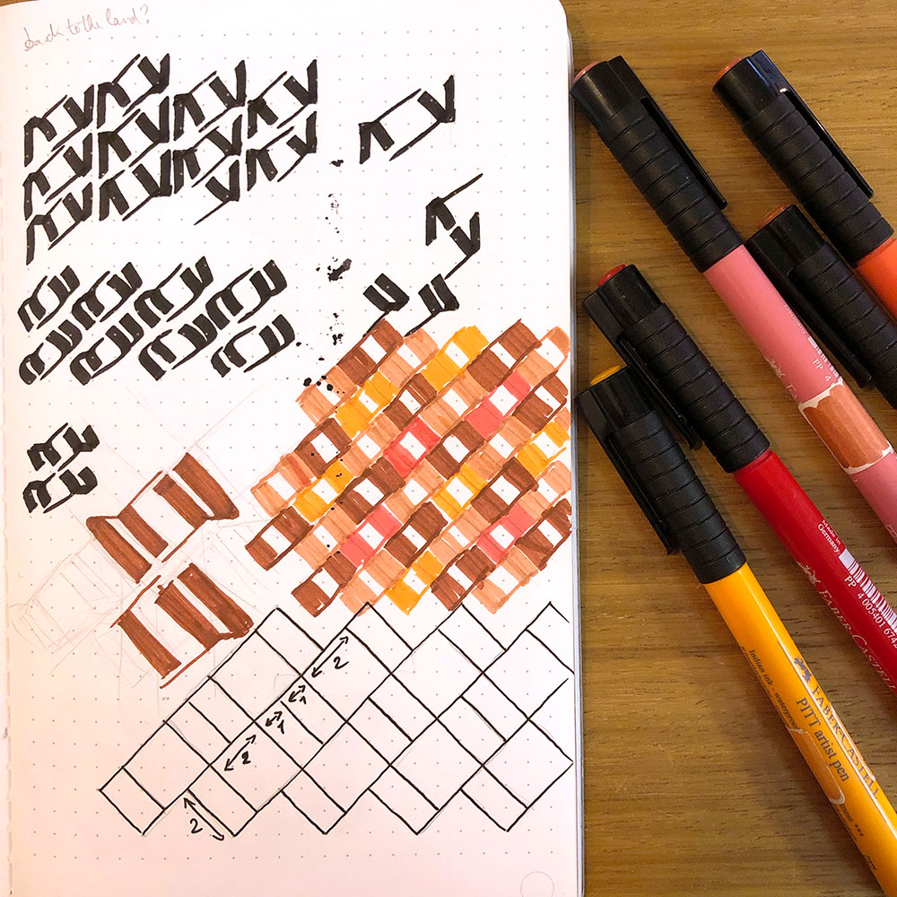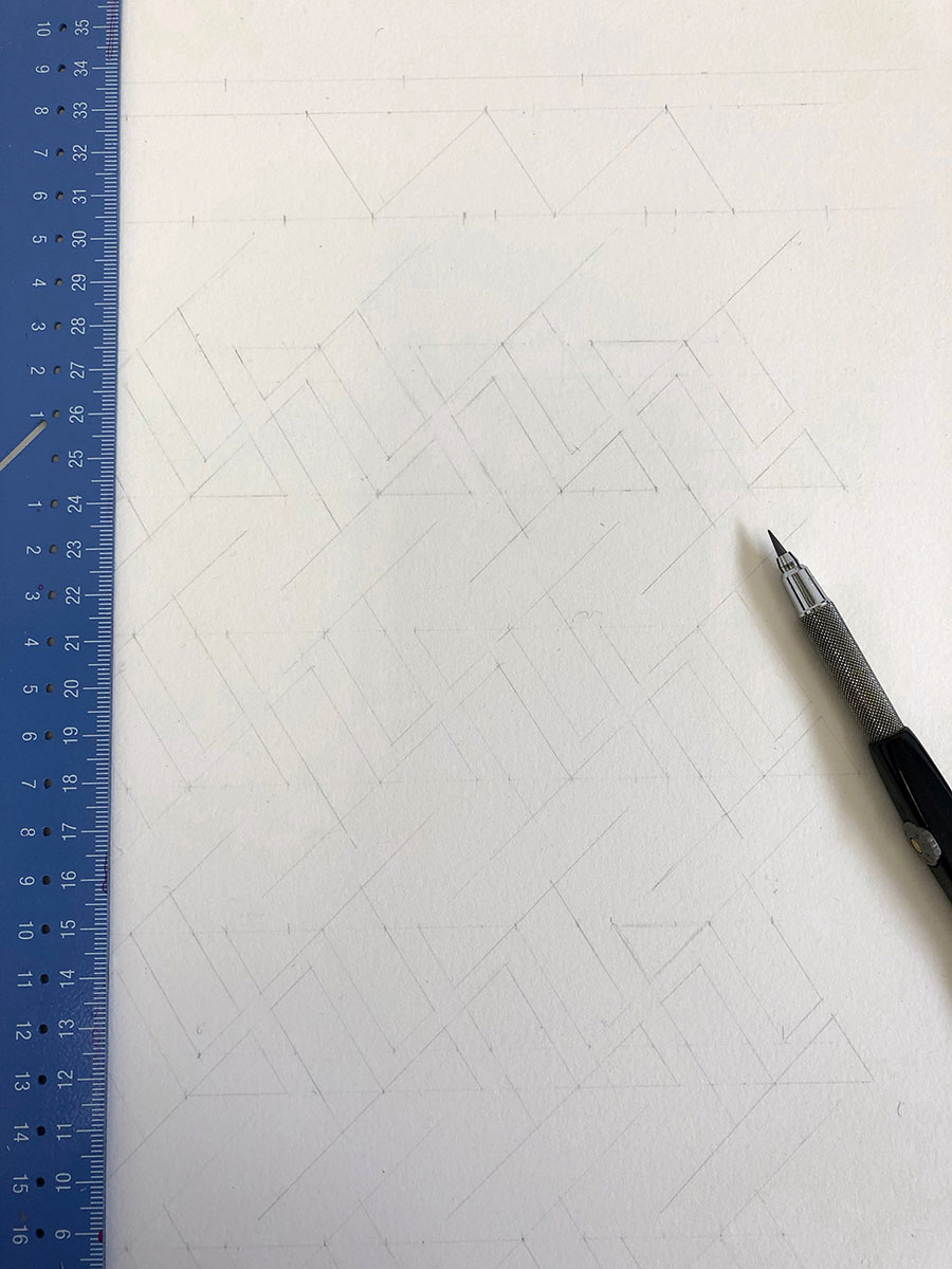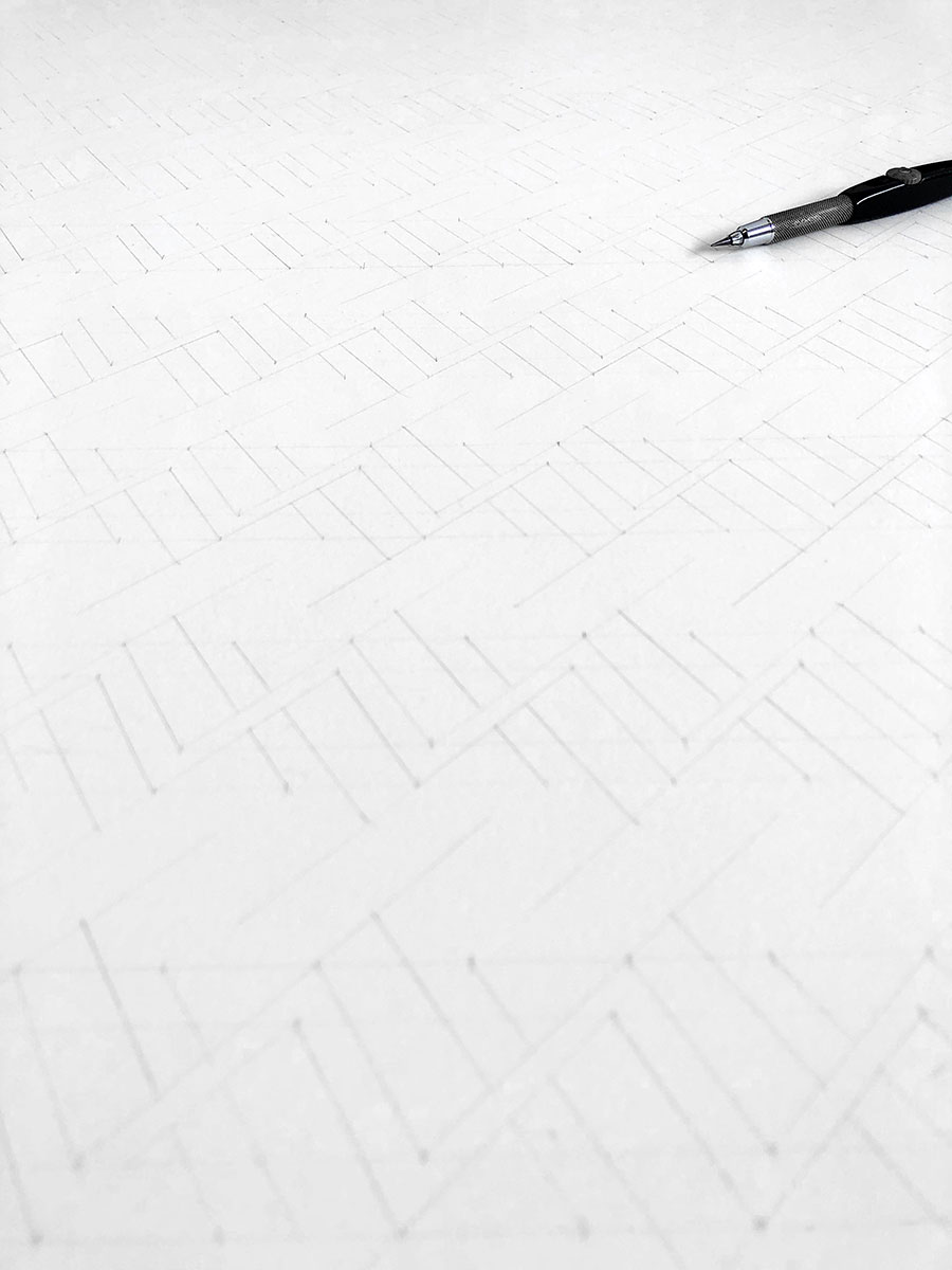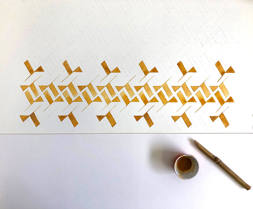 The style is Eastern Kufic, chosen for the striking geometry it allowed to unfold around this simple word. Uncharacteristically, I had to construct the full pattern before writing it with a pen, because the interplay of angles was so complex and unforgiving.