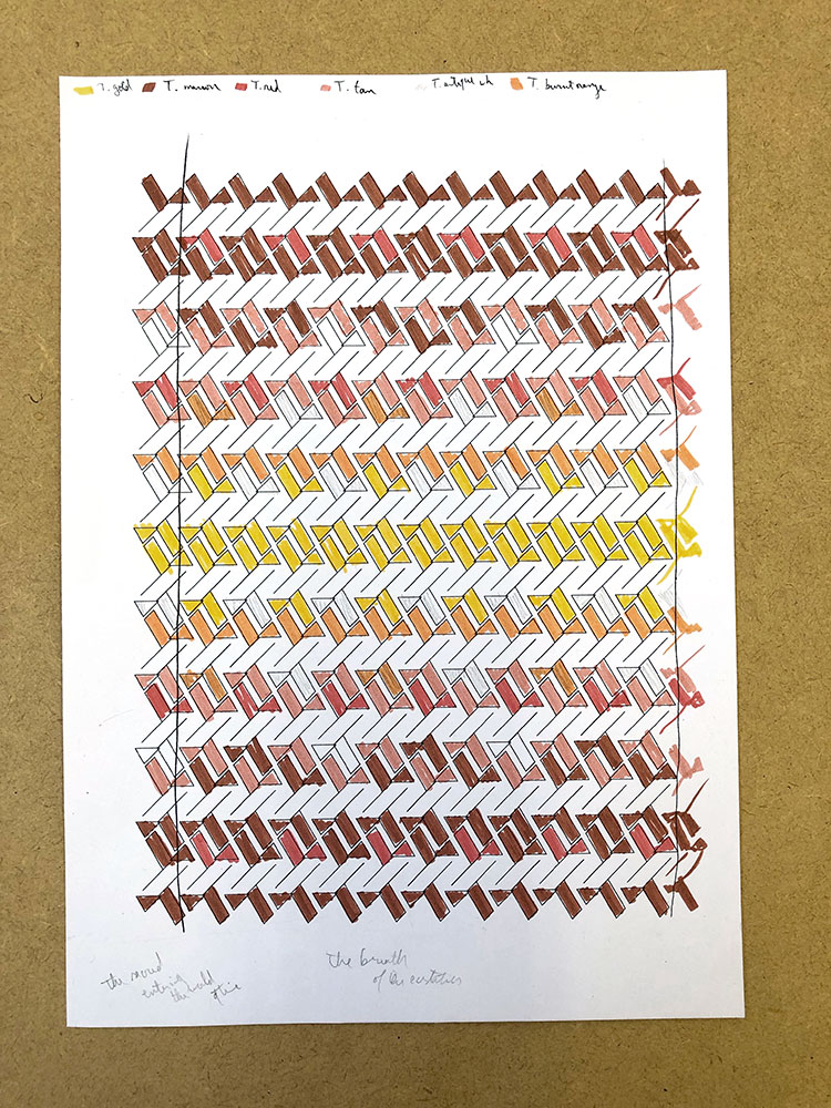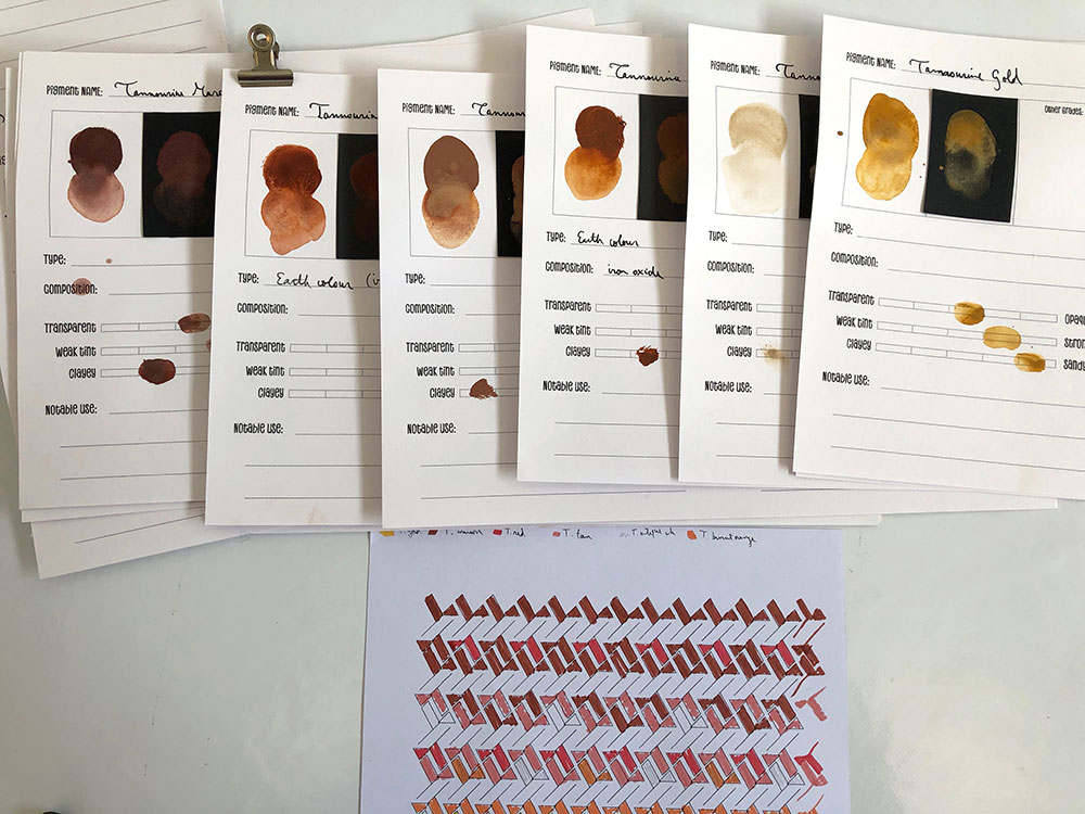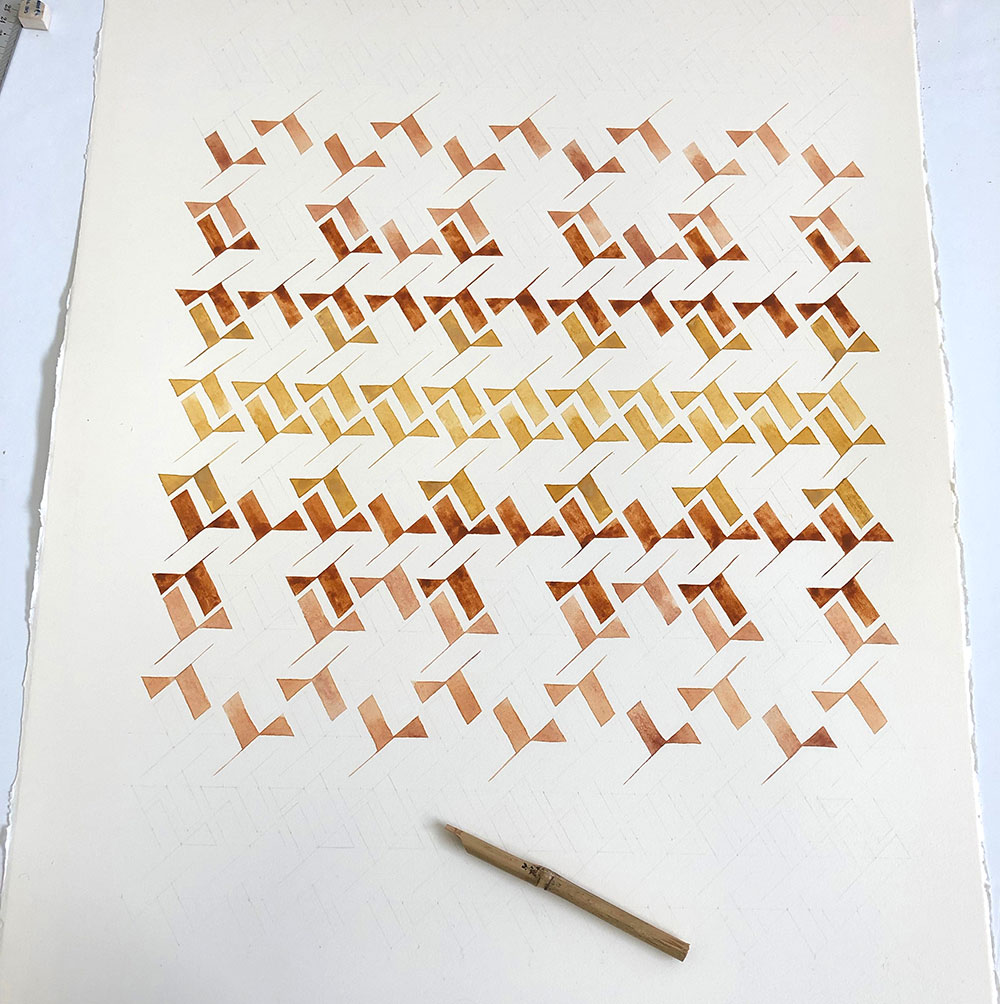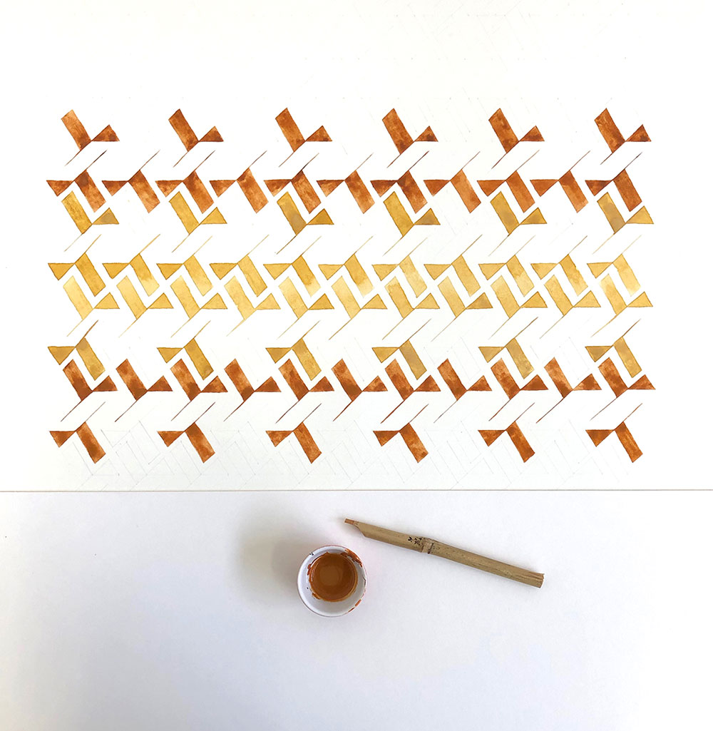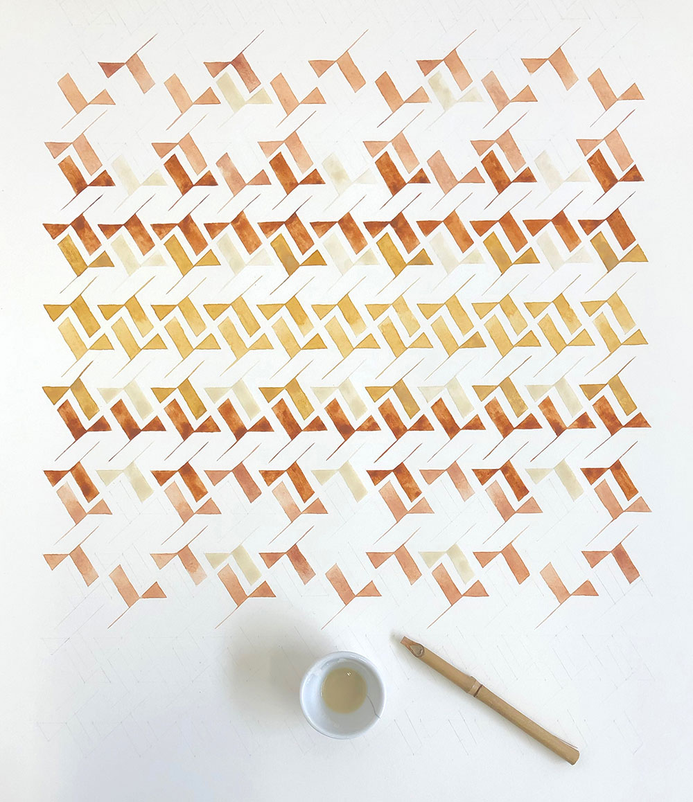 I like to call this piece “single origin” because it is made with six earth pigments all gathered in the same place, on the same day, in the mountains of Lebanon. The piece was inspired by this bountiful palette, and the word is barr, which denotes the land, the earth, the wilderness, its adjective barri meaning untamed, feral, wild; at the same time, the same word pronounced birr means great love, devotion and reverence.