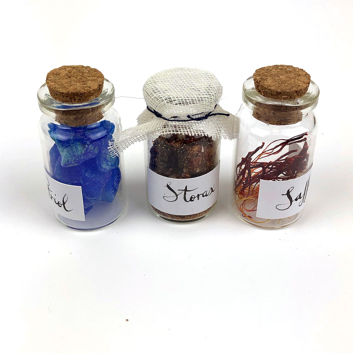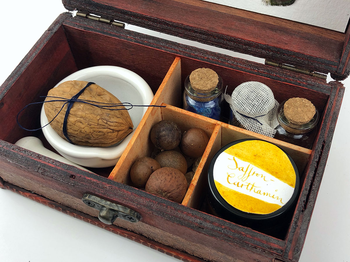 One of 7 planet-themed boxes that were made as groundwork and practice for this collection. They draw both on my work with cosmology and on my study of Abbasid-era art materials, Inks & Paints of the Middle-East. The latter book was included with the boxes and contained the clues for deciphering the contents. One piece of information: Venus is associated with green and copper, but also lapis lazuli.