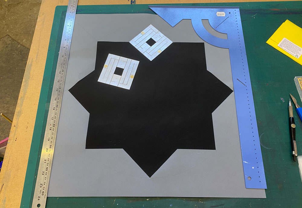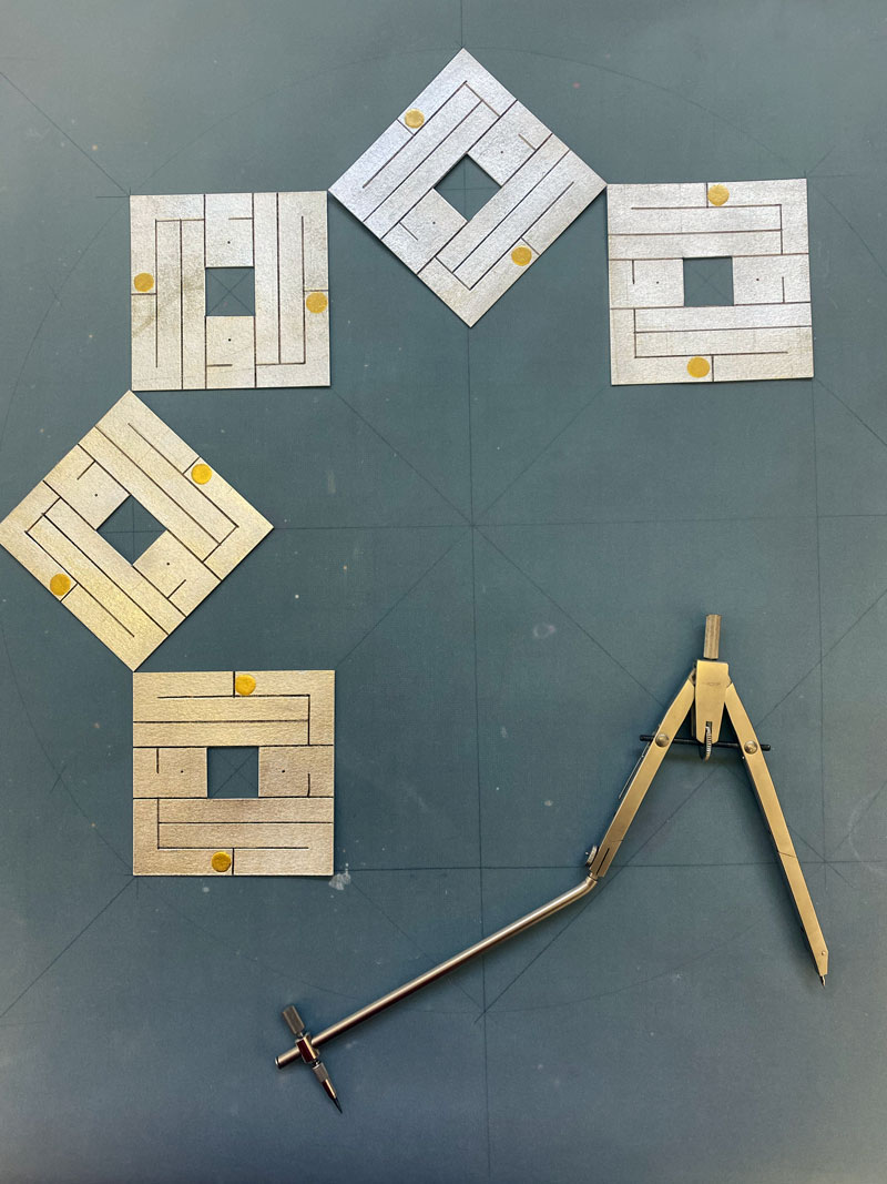 This is the third piece in this series pondering the ending of a world and what may emerge from the ashes. After completion, the piece was left exposed so the silver leaf tarnished over several months, darkening till it almost faded into the background. But the gold dots, originally hard to see, are not touched by decay and stand out all the more for it.